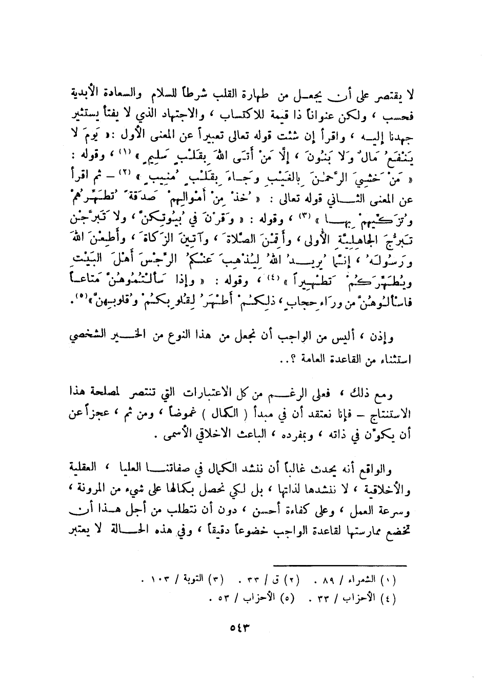 لا يقتصر على أن يجعل من طهارة القلب شرطًا للسلام والسعادة الأبدية فحسب، ولكن عنوانًا ذا قيمة للاكتساب، والاجتهاد الذي لا يفتأ يستثير جهدنا إليه، واقرأ إن شئت قوله تعالى تعبيرًا عن المعنى الأول: {يَوْمَ لا يَنْفَعُ مَالٌ وَلا بَنُونَ، إِلَّا مَنْ أَتَى اللَّهَ بِقَلْبٍ سَلِيمٍ} 1، وقوله: {مَنْ خَشِيَ الرَّحْمَنَ بِالْغَيْبِ وَجَاءَ بِقَلْبٍ مُنِيبٍ} 2 -ثم اقرأ عن المعنى الثاني قوله تعالى: {خُذْ مِنْ أَمْوَالِهِمْ صَدَقَةً تُطَهِّرُهُمْ وَتُزَكِّيهِمْ بِهَا} 3، وقوله: {وَقَرْنَ فِي بُيُوتِكُنَّ وَلا تَبَرَّجْنَ تَبَرُّجَ الْجَاهِلِيَّةِ الْأُولَى وَأَقِمْنَ الصَّلاةَ وَآتِينَ الزَّكَاةَ وَأَطِعْنَ اللَّهَ وَرَسُولَهُ إِنَّمَا يُرِيدُ اللَّهُ لِيُذْهِبَ عَنْكُمُ الرِّجْسَ أَهْلَ الْبَيْتِ وَيُطَهِّرَكُمْ تَطْهِيرًا} 4، وقوله: {وَإِذَا سَأَلْتُمُوهُنَّ مَتَاعًا فَاسْأَلوهُنَّ مِنْ وَرَاءِ حِجَابٍ ذَلِكُمْ أَطْهَرُ لِقُلُوبِكُمْ وَقُلُوبِهِنَّ} 5.