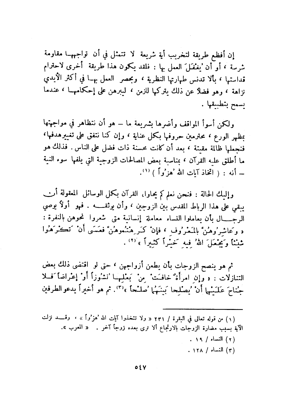 ولكن أسوأ المواقف وأضرها بشريعة ما -هو أن نتظاهر في مواجهتها بمظهر الورع، محترمين حروفها بكل عناية، وإن كنا نتفق على تغيير هدفها فنجعلها ظالمة مقيتة، بعد أن كانت محسنة ذات فضل على الناس. فذلك هو ما أطلق عليه القرآن، بمناسبة بعض المصالحات الزوجية التي يلفها سوء النية -أنه: "اتخاذ آيات الله هزوًا"1.