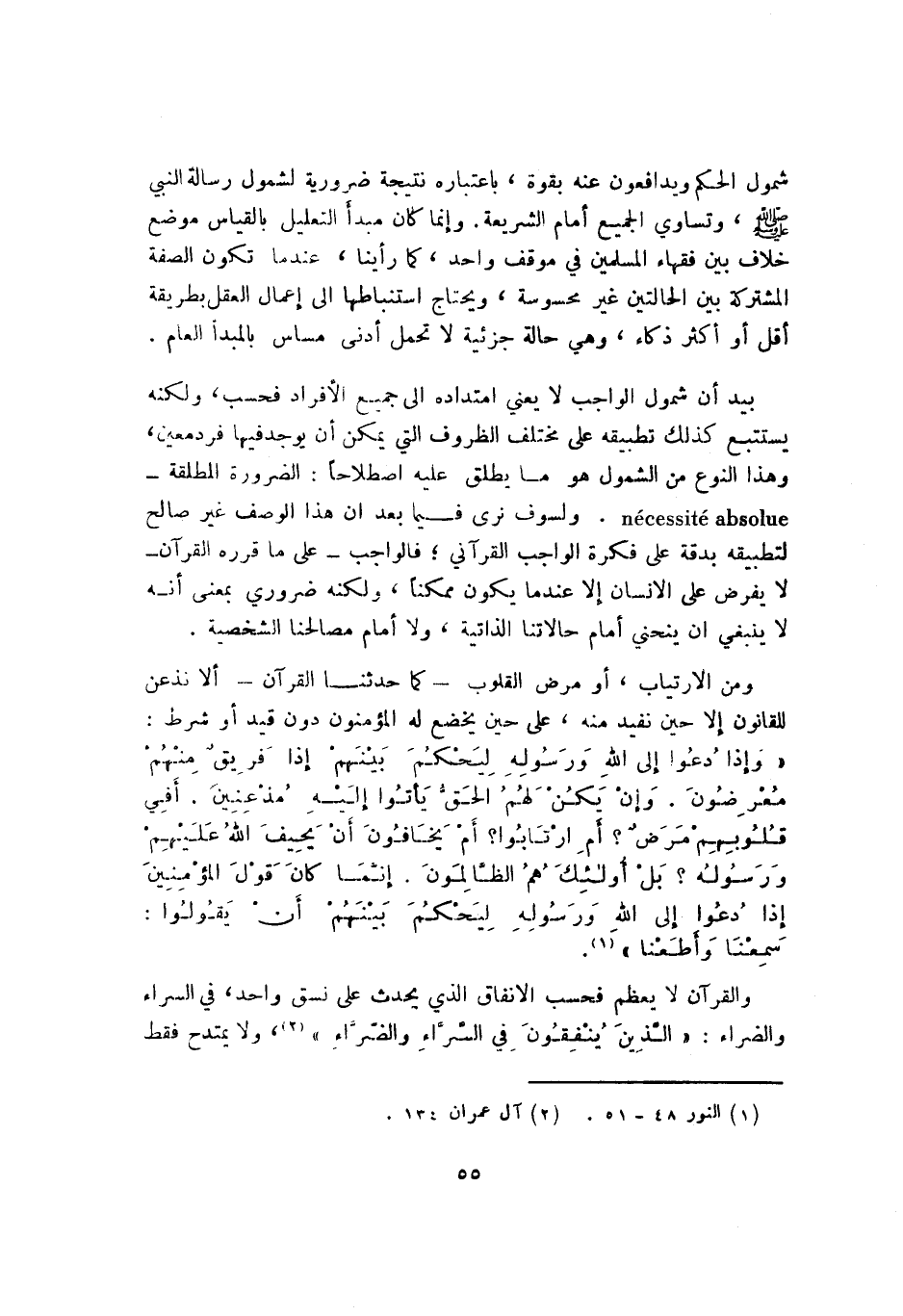 بيد أن شمول الواجب لا يعني امتداده إلى جميع الأفراد فحسب، ولكنه يستتبع كذلك تطبيقه على مختلف الظروف التي يمكن أن يوجد فيها فرد معين، وهذا النوع من الشمول هو ما يطلق عليه اصطلاحًا: الضرورة المطلقة -NECESSITE ABSOLUE. ولسوف نرى فيما بعد أن هذا الوصف غير صالح لتطبيقه بدقة على فكرة الواجب القرآني؛ فالواجب -على ما قرره القرآن- لا يفرض على الإنسان إلا عندما يكون ممكنًا، ولكنه ضروري بمعنى أنه لا ينبغي أن ينحني أمام حالاتنا الذاتية، ولا أمام مصالحنا الشخصية.