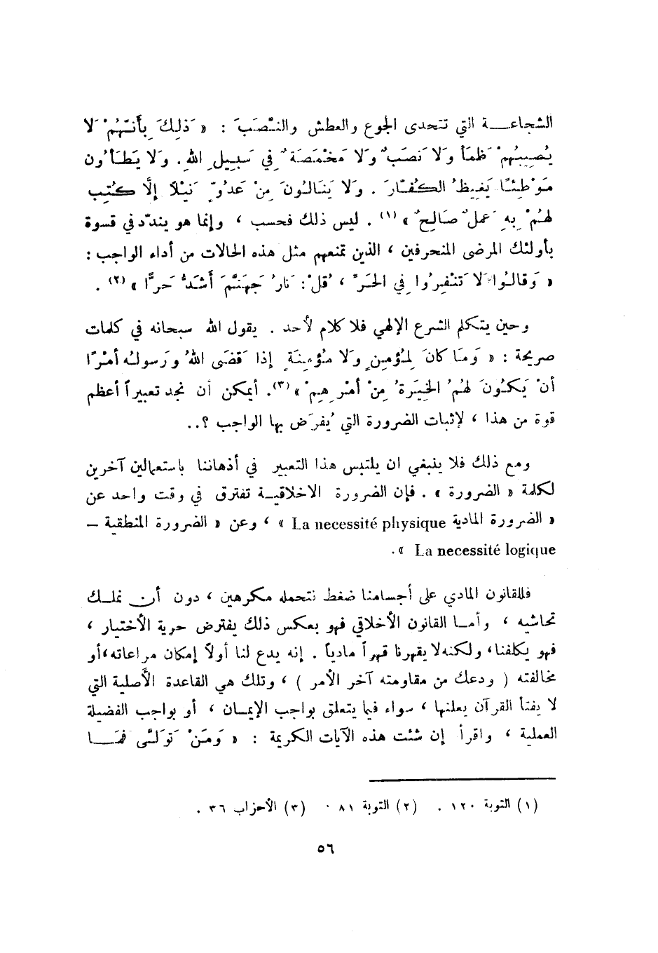 فللقانون المادي على أجسامنا ضغط نتحمله مكرهين، دون أن نملك تحاشيه، وأما القانون الأخلاقي فهو بعكس ذلك يفترض حرية الاختيار، فهو يكلفنا، ولكنه لا يقهرنا قهرًا ماديًّا. إنه يدع لنا أولًا إمكان مراعاته، أو مخالفته "ودعك من مقوامته آخر الأمر"، وتلك هي القاعدة الأصلية التي لا يفتأ القرآن يعلنها، سواء فيما يتعلق بواجب الإيمان، أو بواجب الفضيلة العملية، واقرأ إن شئت هذه الآيات الكريمة: {وَمَنْ تَوَلَّى فَمَا