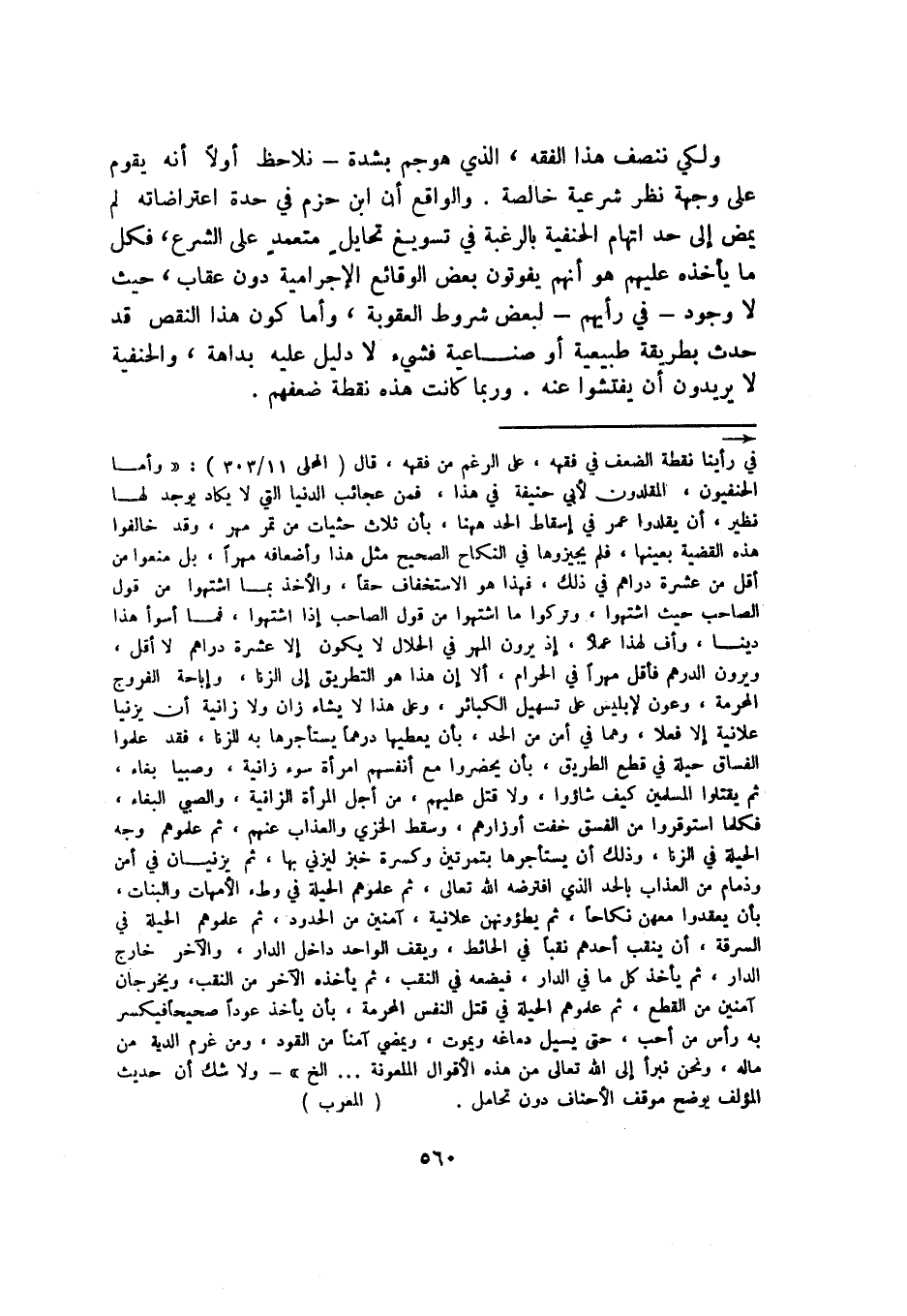 =في رأينا نقطة الضعف في فقهه، على الرغم من فقهه، قال "المحلى 11/ 303": "وأما الحنفيون، المقلدون لأبي حنيفة في هذا، فمن عجائب الدنيا التي لا يكاد يوجد لها نظير، أن يقلدوا عمر في إسقاط الحد ههنا، بأن ثلاث حثيات من تمر مهر، وقد خالفوا هذه القضية بعينها، فلم يجيزوها في النكاح الصحيح مثل هذا وأضعافه مهرًا، بل منعوا من أقل من عشرة دراهم في ذلك. فهذا هو الاستخفاف حقًّا، والأخذ بما اشتهوا من قول الصاحب حيث اشتهوا، وتركوا ما اشتهوا من قول الصاحب إذا اشتهوا. فما أسوأ هذا دينًا، وأف لهذا عملًا، إذ يرون المهر في الحلال لا يكون إلا عشرة دراهم لا أقل، ويرون الدرهم فأقل مهرًا في الحرام، ألا إن هذا هو التطريق إلى الزنا، وإباحة الفروج المحرمة، وعون لإبليس على تسهيل الكبائر، وعلى هذا لا يشاء زان ولا زانية أن يزنيا علانية إلا فعلا، وهما في أمن من الحد، بأن يعطيها درهمًا يستأجرها به للزنا، فقد علموا الفساق حيلة في قطع الطريق، بأن يحضروا مع أنفسهم امرأة سوء زانية، وصبيًّا بغاء، ثم يقتلوا المسلمين كيف شاءوا، ولا قتل عليهم، من أجل المرأة الزانية، والصبي البغاء، فكلما استوقروا من الفسق خفت أوزارهم، وسقط الخزي والعذاب عنهم، ثم علموهم وجه الحيلة في الزنا، وذلك أن يستأجرها بتمرتين وكسرة خبز ليزني بها، ثم يزنيان في أمن وذمام من العذاب بالحد الذي افترضه الله تعالى، ثم علموهم الحيلة في وطء الأمهات والبنات، بأن يعقدوا معهن نكاحًا، ثم يطئونهن علانية، آمنين من الحدود، ثم علموهم الحيلة في السرقة، أن ينقب أحدهم نقبًا في الحائط، ويقف الواحد داخل الدار، والآخر خارج الدار, ثم يأخذ كل ما في الدار، فيضعه في النقب، ثم يأخذه الآخر من النقب، ويخرجان آمنين من القطع، ثم علموهم الحيلة في قتل النفس المحرمة، بأن يأخذ عودًا صحيحًا فيكسر به رأس من أحب، حتى يسيل دماغه ويموت، ويمضي آمنًا من القود، ومن غرم الدية من ماله، ونحن نبرأ إلى الله تعالى من هذه الأقوال الملعونة ... إلخ", ولا شك أن حديث المؤلف يوضح موقف الأحناف دون تحامل. "المعرب".