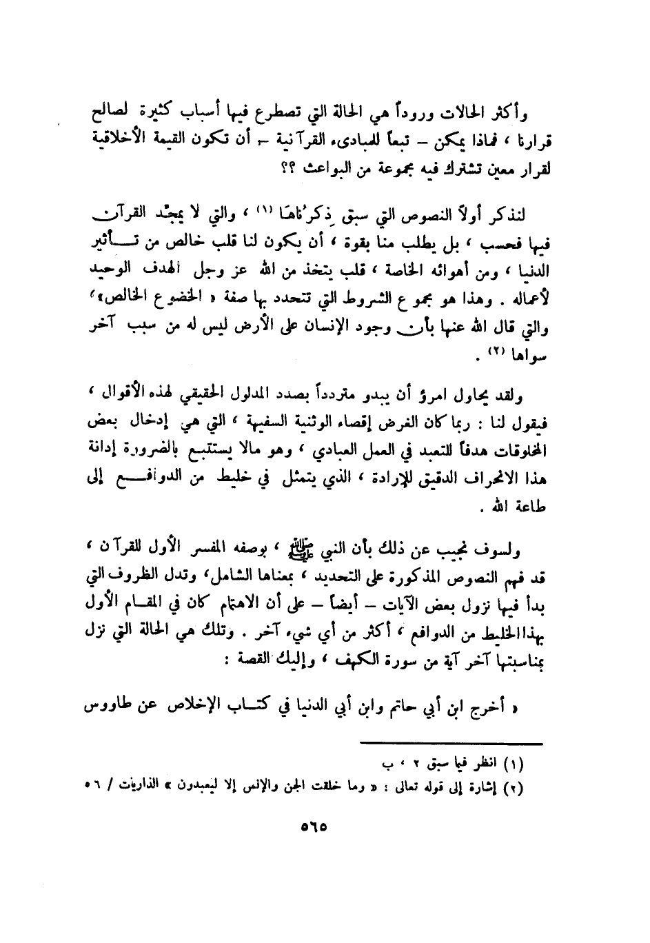 لنذكر أولًا النصوص التي سبق ذِكْرُنَاهَا1، والتي لا يمجد القرآن فيها فحسب، بل يطلب منا بقوة، أن يكون لنا قلب خالص من تأثير الدنيا، ومن أهوائه الخاصة، قلب يتخذ من الله -عز وجل- الهدف الوحيد لأعماله. وهذا هو مجموع الشروط التي تتحدد بها صفة "الخضوع الخالص" والتي قال الله عنها بأن وجود الإنسان على الأرض ليس له من سبب آخر سواها2.