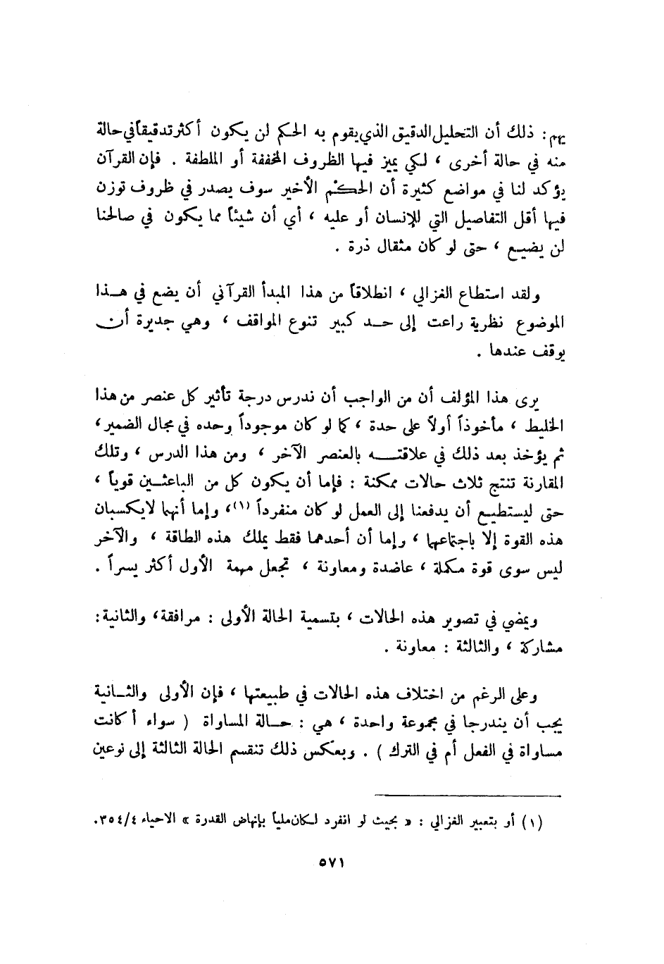 ولقد استطاع الغزالي، انطلاقًا من هذا المبدأ القرآني أن يضع في هذا الموضوع نظرية راعت إلى حد كبير تنوع المواقف، وهي جديرة أن يوقف عندها.