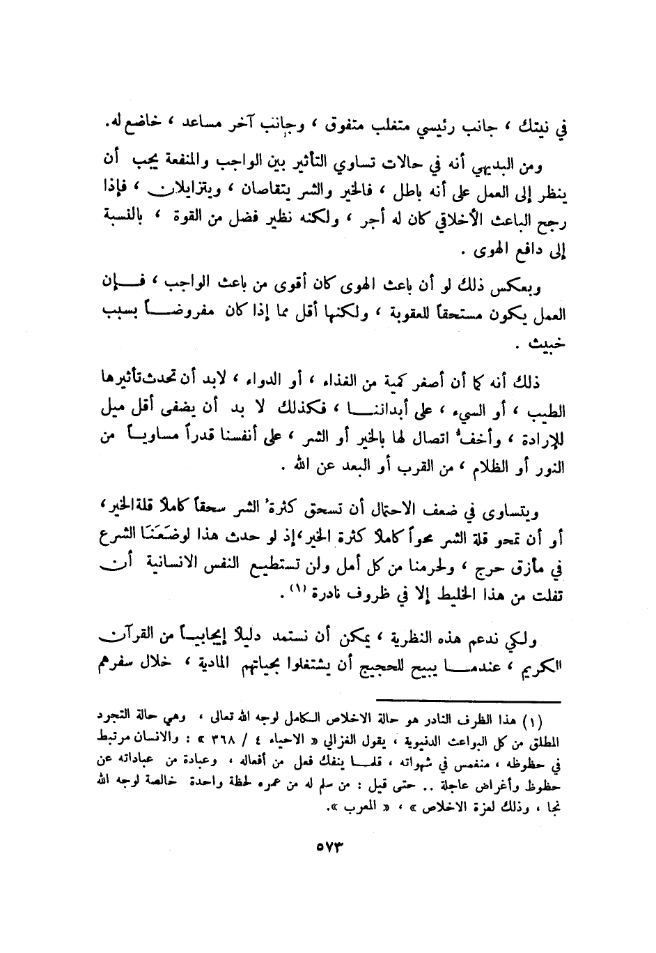 1 هذا الظرف النادر هو حالة الإخلاص الكامل لوجه الله تعالى، وهي حالة التجرد المطلق من كل البواعث الدنيوية، يقول الغزالي "الإحياء 4/ 368": والإنسان مرتبط في حظوظه، منغمس في شهواته، قلما ينفك فعل من أفعاله، وعبادة من عباداته عن حظوظ وأغراض عاجلة ... حتى قيل: "من سلم له من عمره لحظة واحدة خالصة لوجه الله نجا، وذلك لعزة الإخلاص". "المعرب".