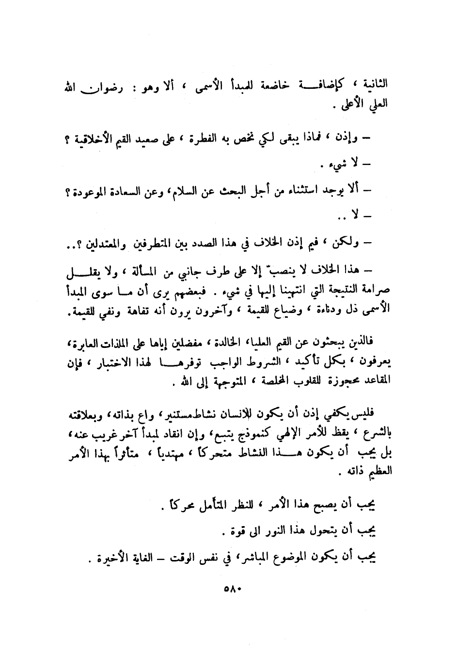 فليس يكفي إذن أن يكون للإنسان نشاط مستنير، واعٍ بذاته، وبعلاقته بالشرع، يقظ للأمر الإلهي كنموذج يتبع، وإن انقاد لمبدأ آخر غريب عنه، بل يجب أن يكون هذا النشاط متحركًا، مهتديًا، متأثرًا بهذا الأمر العظيم ذاته.