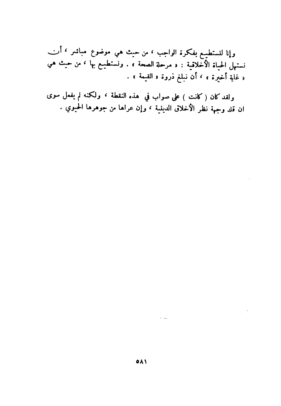 وإنا لنستطيع بفكرة الواجب، من حيث هي موضوع مباشر، أن نستهل الحياة الأخلاقية: "مرحلة الصحة". ونستطيع بها، من حيث هي "غاية أخيرة"، أن نبلغ ذروة "القيمة".