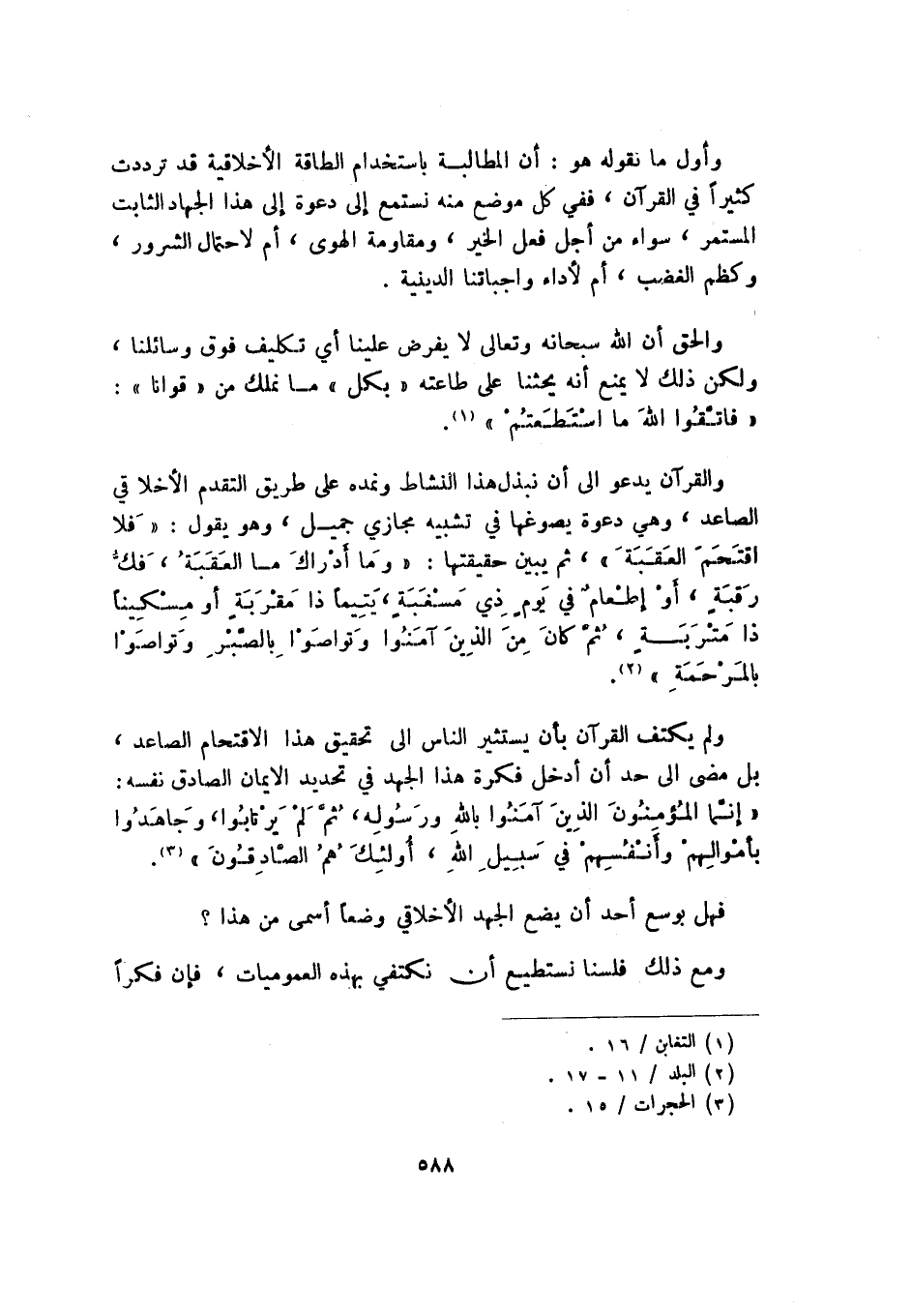 وأول ما نقوله هو: أن المطالبة باستخدام الطاقة الأخلاقية قد ترددت كثيرًا في القرآن، ففي كل موضع منه نستمع إلى دعوة إلى هذا الجهاد الثابت المستمر، سواء من أجل فعل الخير، ومقاومة الهوى، أو لاحتمال الشرور، وكظم الغضب، أو لأداء واجباتنا الدينية.