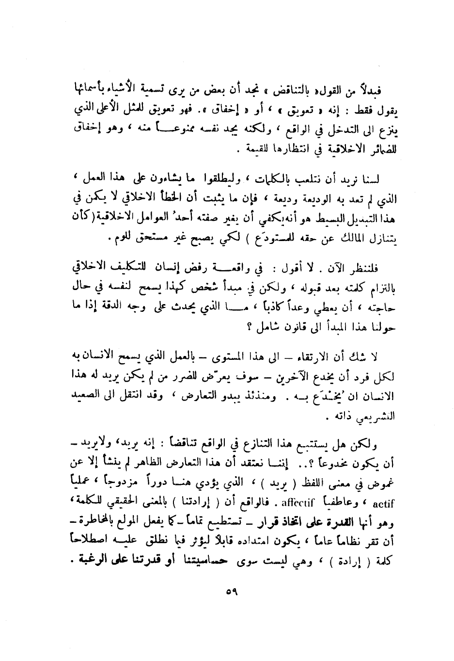 ولكن هل يستتبع هذا التنازع في الواقع تناقضًا: إنه يريد، ولا يريد -أن يكون مخدوعًا؟ إننا نعتقد أن هذا التعارض الظاهر لم ينشأ إلا عن غموض في معنى اللفظ "يريد"، الذي يؤدي هنا دورًا مزدوجًا، عمليًّا ACTIF، وعاطفيًّا AFFECTIF. فالواقع أن "إرادتنا" بالمعنى الحقيقي للكلمة، وهو أنها القدرة على اتخاذ قرار -تستطيع تمامًا -كما يفعل المولع بالمخاطرة - أن تقر نظامًا عامًّا، يكون امتداده قابلًا ليؤثر فيما نطلق عليه اصطلاحًا كلمة "إرادة"، وهي ليست سوى حساسيتنا أو قدرتنا على الرغبة.