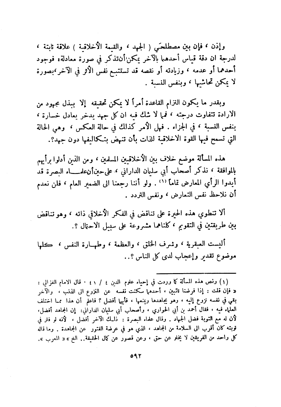 وإذن، فإن بين مصطلحي "الجهد، والقيمة الأخلاقية" علاقة ثابتة، لدرجة أن دقة قياس أحدهما بالآخر يمكن أن تذكر في صورة معادلة: فوجود أحدهما أو عدمه، وزيادته أو نقصه قد تستتبع نفس الأثر في الآخر، بصورة لا يمكن تحاشيها، وبنفس النسبة.