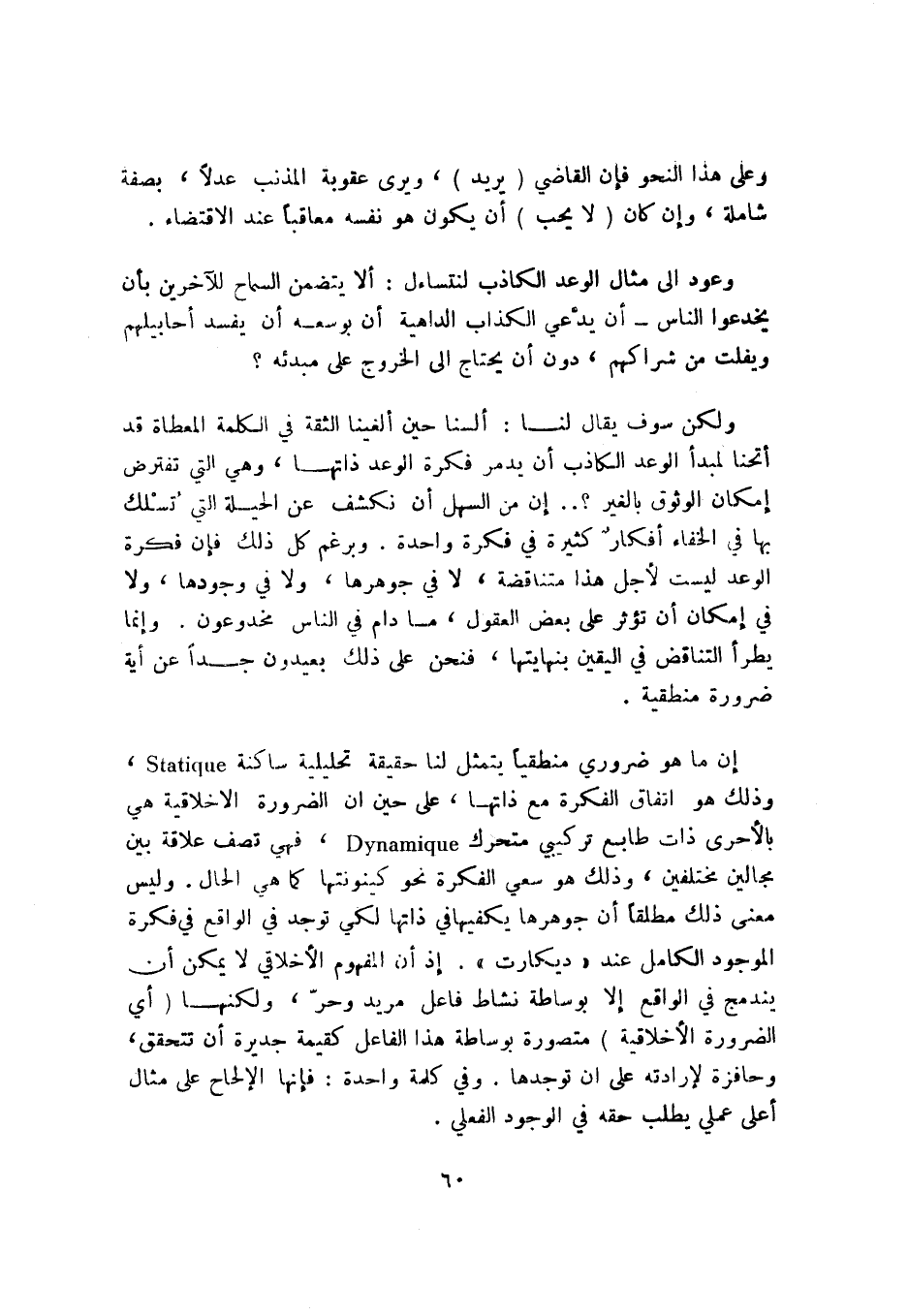 ولكن سوف يقال لنا: ألسنا حين ألغينا الثقة في الكلمة المعطاة قد أتحنا لمبدأ الوعد الكاذب أن يدمر فكرة الوعد ذاتها، وهي التي تفترض إمكان الوثوق بالغير؟ إن من السهل أن نكشف عن الحيلة التي تسلك بها في الخفاء أفكار كثيرة في فكرة واحدة. وبرغم كل ذلك فإن فكرة الوعد ليست لأجل هذا متناقضة، لا في جوهرها، ولا في وجودها، ولا في إمكان أن تؤثر على بعض العقول، ما دام في الناس مخدوعون. وإنما يطرأ التناقض في اليقين بنهايتها، فنحن على ذلك بعيدون جدًّا عن آية ضرورة منطقية.