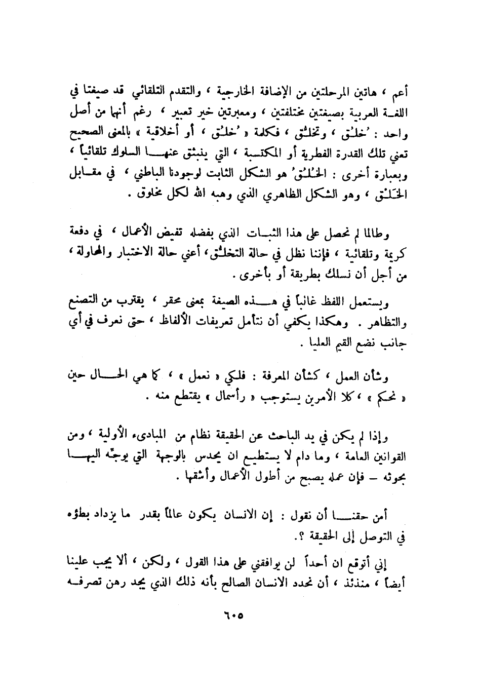 أعم، هاتين المرحلتين من الإضافة الخارجية، والتقدم التلقائي قد صيغتا في اللغة العربية بصيغتين مختلفتين، ومعبرتين خير تعبير، رغم أنهما من أصل واحد: خلق، وتخلق، فكلمة "خلق، أو أخلاقية" بالمعنى الصحيح تعني تلك القدرة الفطرية أو المكتسبة، التي ينبثق عنها السلوك تلقائيًّا وبعبارة أخرى: الخلق هو الشكل الثابت لوجودنا الباطني، في مقابل الخلق، وهو الشكل الظاهري الذي وهبه الله لكل مخلوق.