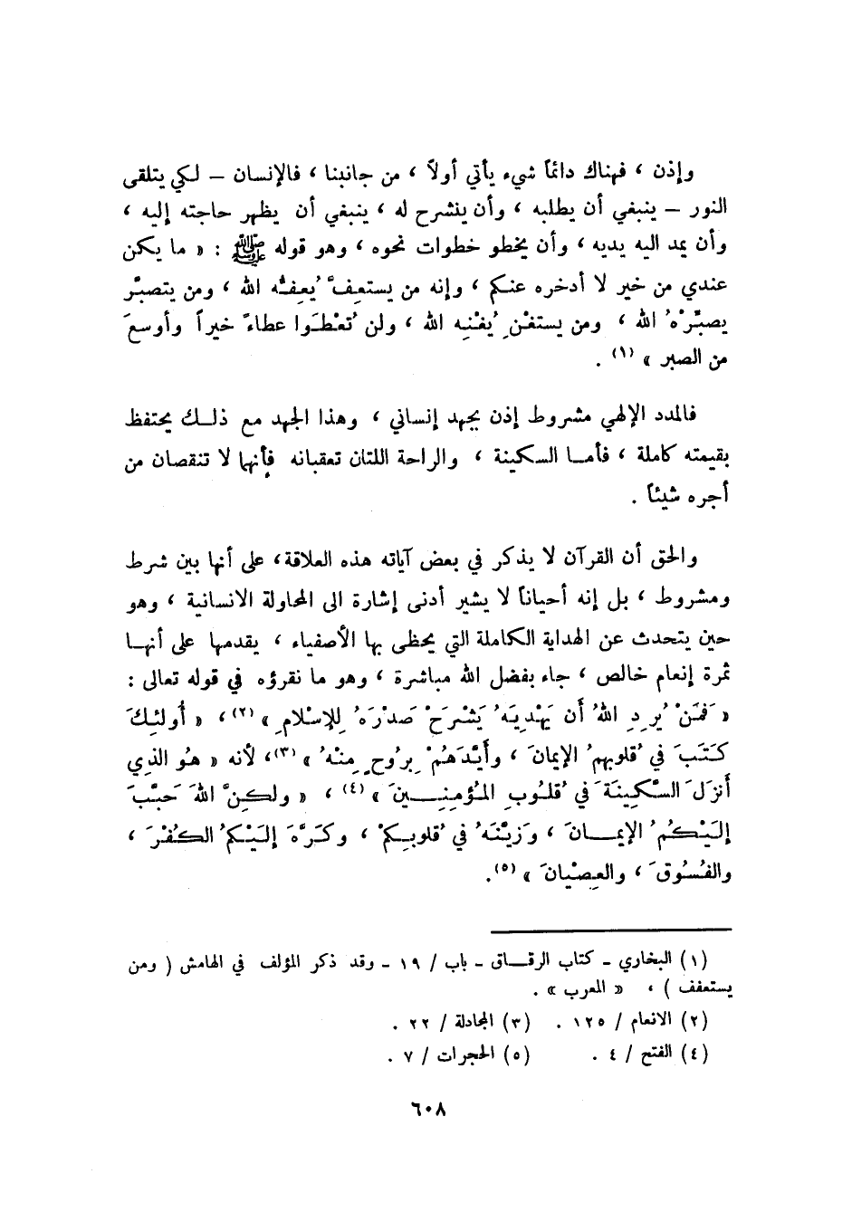 والحق أن القرآن لا يذكر في بعض آياته هذه العلاقة، على أنها بين شرط ومشروط، بل إنه أحيانًا لا يشير أدنى إشارة إلى المحاولة الإنسانية، وهو حين يتحدث عن الهداية الكاملة التي يحظى بها الأصفياء، يقدمها على أنها ثمرة إنعام خالص، جاء بفضل الله مباشرة، وهو ما نقرؤه في قوله تعالى: {فَمَنْ يُرِدِ اللَّهُ أَنْ يَهْدِيَهُ يَشْرَحْ صَدْرَهُ لِلإِسْلامِ} 2، {أُولَئِكَ كَتَبَ فِي قُلُوبِهِمُ الْإِيمَانَ وَأَيَّدَهُمْ بِرُوحٍ مِنْهُْ} 3؛ لأنه {هُوَ الَّذِي أَنْزَلَ السَّكِينَةَ فِي قُلُوبِ الْمُؤْمِنِينَ} 4، {وَلَكِنَّ اللَّهَ حَبَّبَ إِلَيْكُمُ الْإِِيمَانَ وَزَيَّنَهُ فِي قُلُوبِكُمْ وَكَرَّهَ إِلَيْكُمُ الْكُفْرَ وَالْفُسُوقَ وَالْعِصْيَانَ} 5.