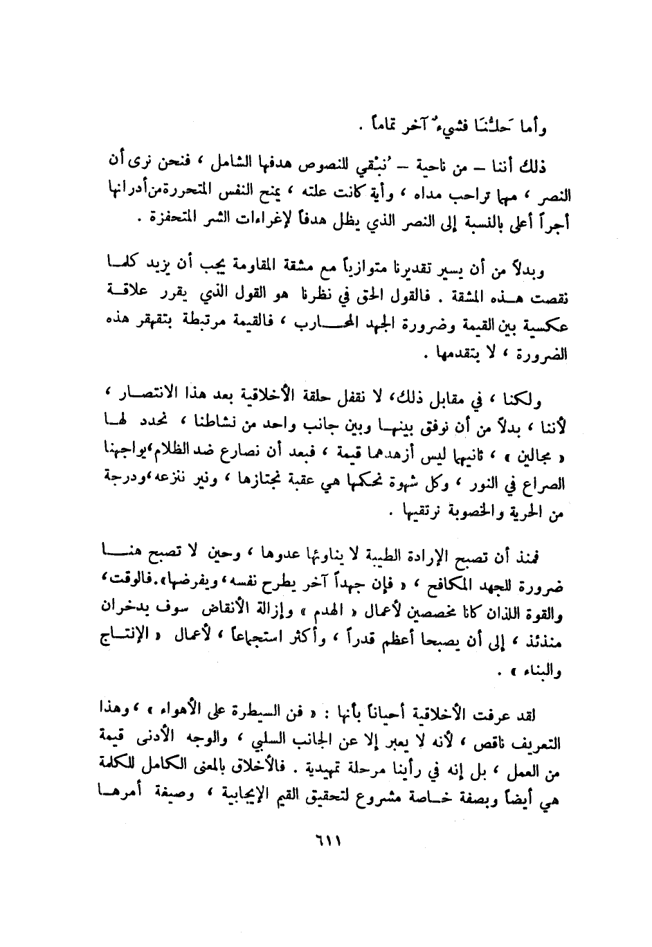 وبدلًا من أن يسير تقديرنا متوازيًا مع مشقة المقاومة يجب أن يزيد كلما نقصت هذه المشقة. فالقول الحق في نظرنا، هو القول الذي يقرر علاقة عكسية بين القيمة وضرورة الجهد المحارب، فالقيمة مرتبطة بتقهقر هذه الضرورة، لا بتقدمها.