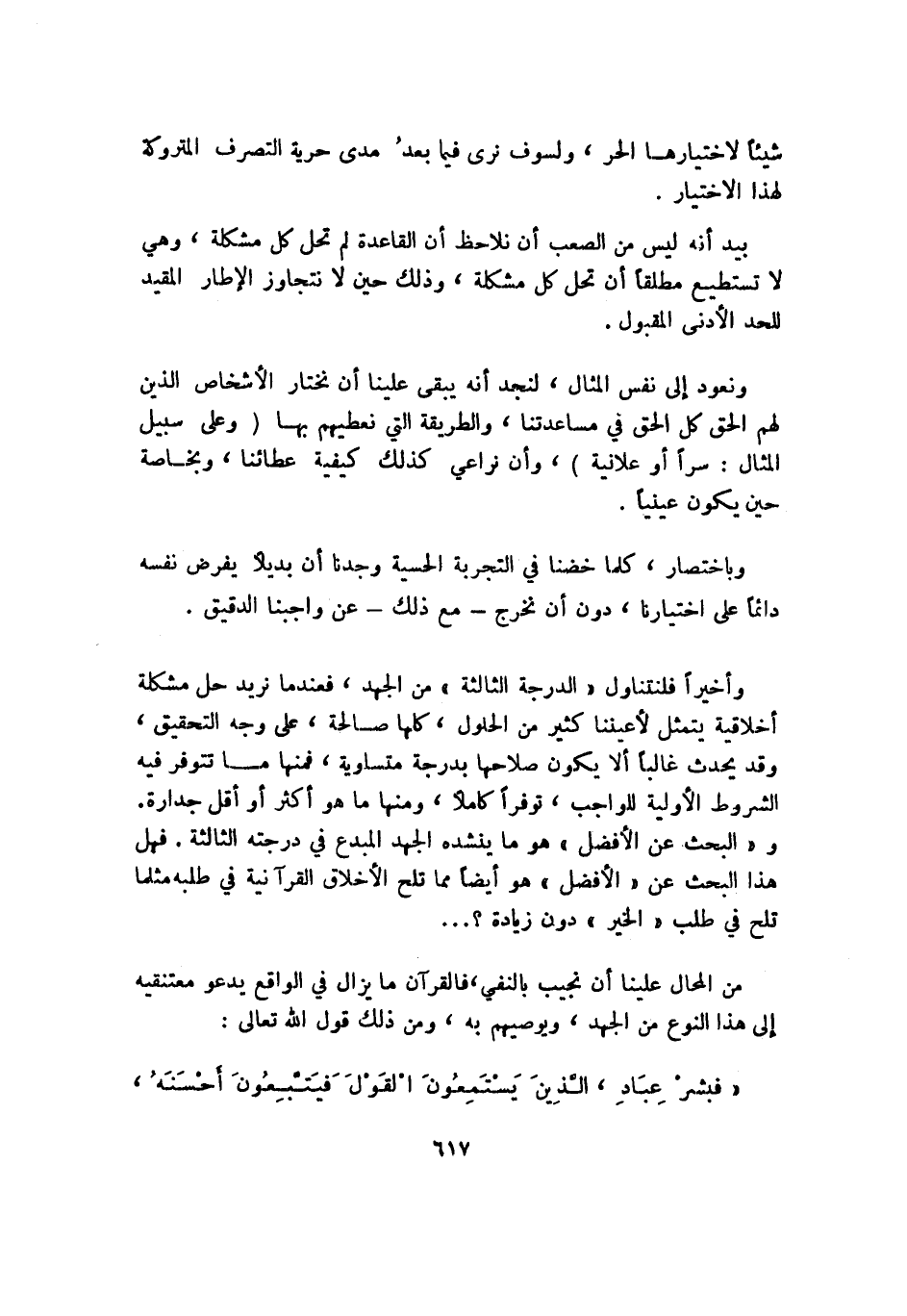 وأخيرًا فلنتناول "الدرجة الثالثة" من الجهد، فعندما نريد حل مشكلة أخلاقية يتمثل لأعيننا كثير من الحلول، كلها صالحة على وجه التحقيق, وقد يحدث غالبًا ألا يكون صلاحها بدرجة متساوية، فمنها ما تتوفر فيه الشروط الأولية للواجب، توفرًا كاملًا، ومنها ما هو أكثر أو أقل جدارة. و"البحث عن الأفضل" هو ما ينشده الجهد المبدع في درجته الثالثة، فهل هذا البحث عن "الأفضل" هو أيضًا مما تلح الأخلاق القرآنية في طلبه مثلما تلح في طلب "الخير" دون زيادة؟