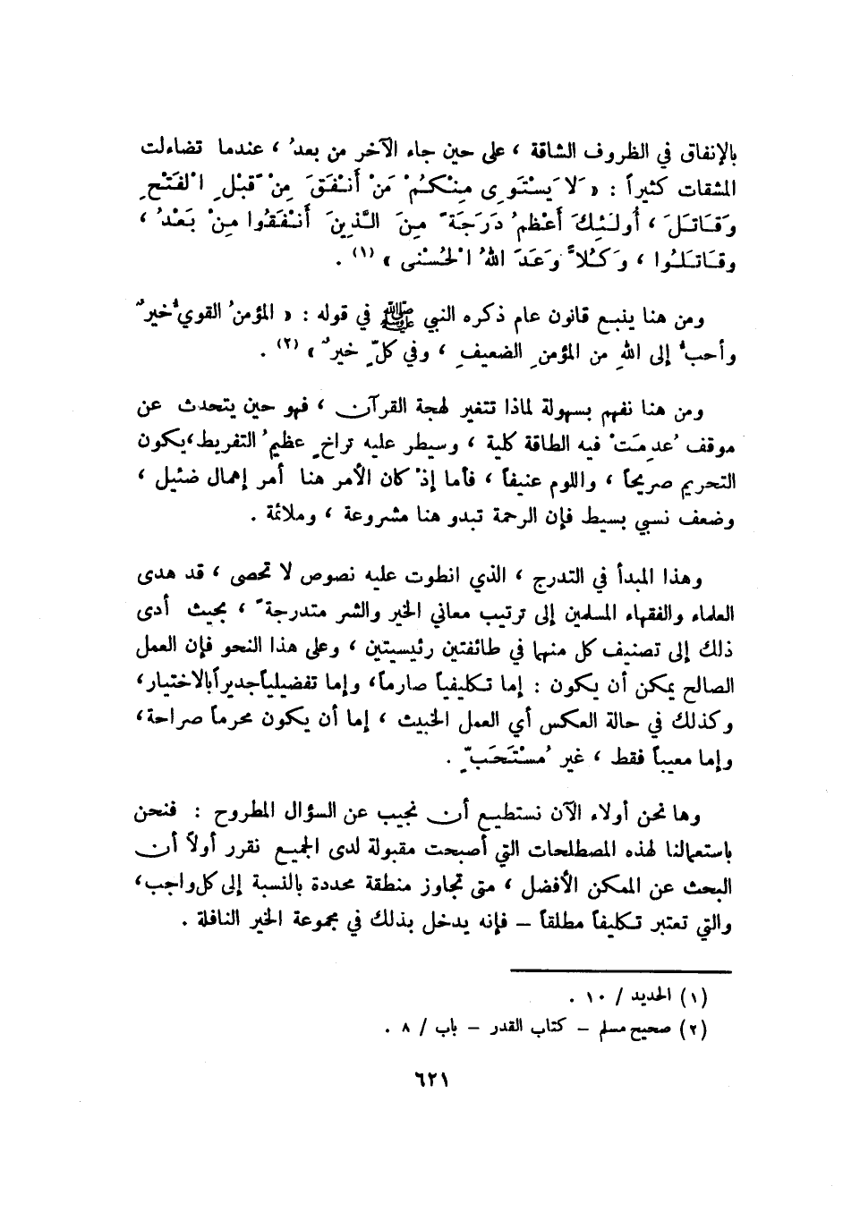 ومن هنا ينبع قانون عام ذكره النبي -صلى الله عليه وسلم- في قوله: "المؤمن القوي خير وأحب إلى الله من المؤمن الضعيف، وفي كل خير" 2.