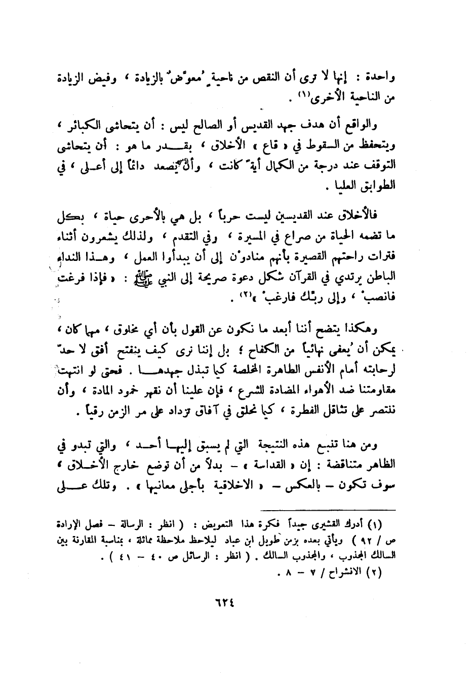 1 أدرك القشيري جيدًا فكرة هذا التعويض. "انظر: الرسالة, فصل الإرادة, ص92" ويأتي بعده بزمن طويل ابن عباد ليلاحظ ملاحظة مماثلة، بمناسبة المقارنة بين السالك المجذوب، والمجذوب السالك. "انظر: الرسائل ص40-41".