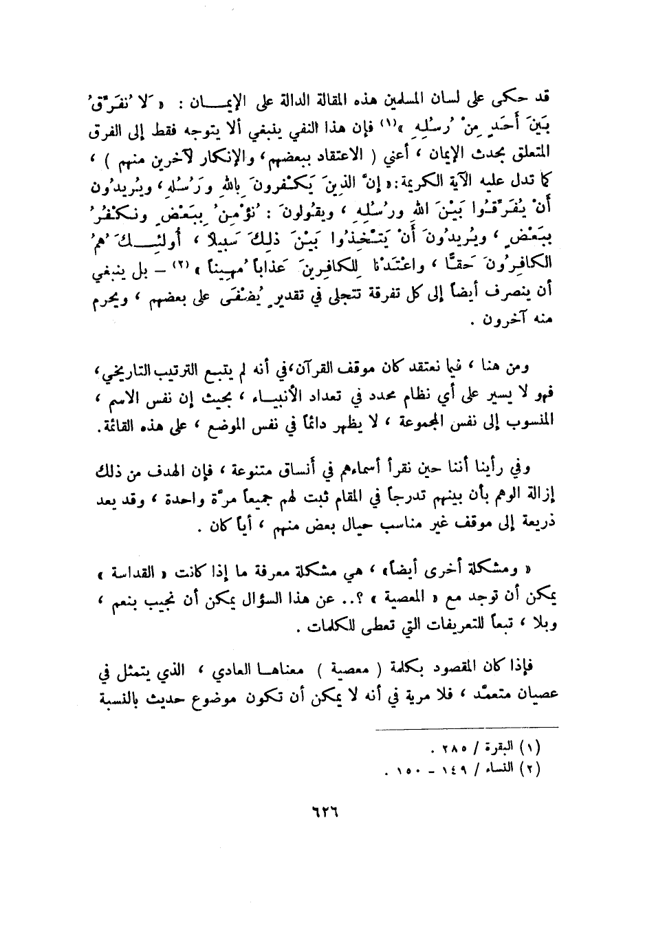 قد حكى على لسان المسلمين هذه المقالة الدالة على الإيمان: {لا نُفَرِّقُ بَيْنَ أَحَدٍ مِنْ رُسُلِهِ} 1 فإن هذا النفي ينبغي ألا يتوجه فقط إلي الفرق المتعلق بحدث الإيمان، أعني "الاعتقاد ببعضهم، والإنكار لآخرين منهم"، كما تدل عليه الآية الكريمة: {إِنَّ الَّذِينَ يَكْفُرُونَ بِاللَّهِ وَرُسُلِهِ وَيُرِيدُونَ أَنْ يُفَرِّقُوا بَيْنَ اللَّهِ وَرُسُلِهِ وَيَقُولُونَ نُؤْمِنُ بِبَعْضٍ وَنَكْفُرُ بِبَعْضٍ وَيُرِيدُونَ أَنْ يَتَّخِذُوا بَيْنَ ذَلِكَ سَبِيلًا، أُولَئِكَ هُمُ الْكَافِرُونَ حَقًّا وَأَعْتَدْنَا لِلْكَافِرِينَ عَذَابًا مُهِينًا} 2, بل ينبغي أن ينصرف أيضًا إلى كل تفرقة تتجلى في تقدير يضفى على بعضهم، ويحرم منه آخرون.