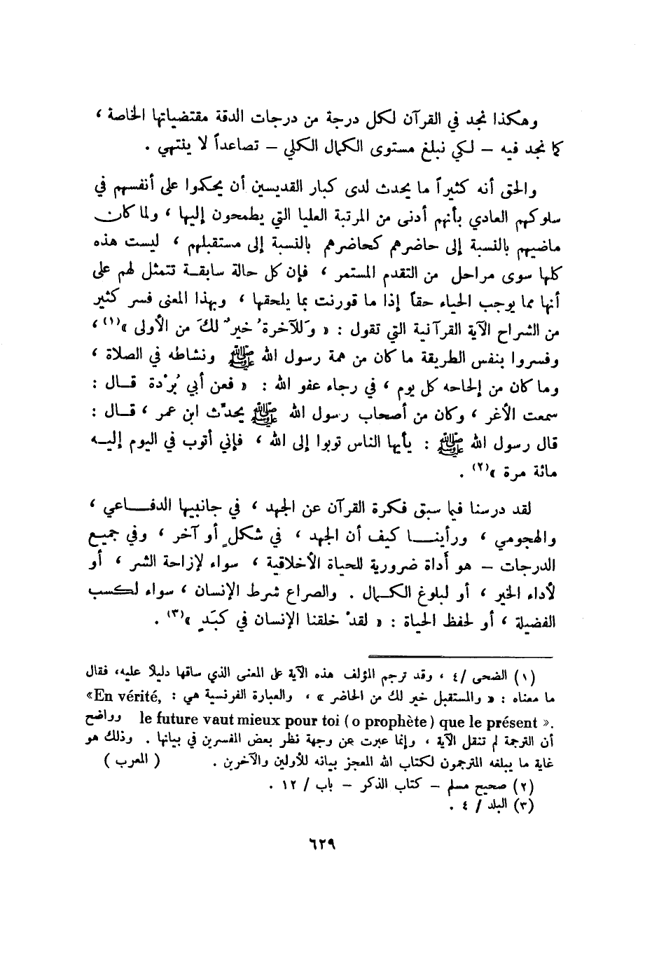 1 الضحى: 4، وقد ترجم المؤلف هذه الآية على المعنى الذي ساقها دليلًا عليه، فقال ما معناه: "والمستقبل خير لك من الحاضر"، والعبارة الفرنسية هي:"en verite, le future vaut mieux pour toi "o prophete" que le present". وواضح أن الترجمة لم تنقل الآية، وإنما عبرت عن وجهة نظر بعض المفسرين في بيانها. وذلك هو غاية ما يبلغه المترجمون لكتاب الله المعجز بيانه للأولين والآخرين. "المعرب"