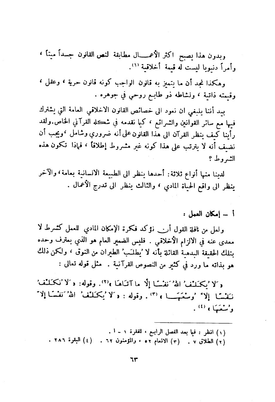 ولعل من نافلة القول أن نؤكد فكرة الإمكان المادي للعمل كشرط لا معدى عنه في الإلزام الأخلاقي. فليس الضمير العام هو الذي يعترف وحده بتلك الحقيقة البدهية القائلة بأنه لا يطلب الطيران من النوق. ولكن ذلك هو بذاته ما ورد في كثير من النصوص القرآنية. مثل قوله تعالى: {لا يُكَلِّفُ اللَّهُ نَفْسًا إِلَّا مَا آتَاهَا} 1. {لا يُكَلِّفُ اللَّهُ نَفْسًا إِلَّا وُسْعَهَا} 2. وقوله: {لا يُكَلِّفُ اللَّهُ نَفْسًا إِلَّا وُسْعَهَا} 3.