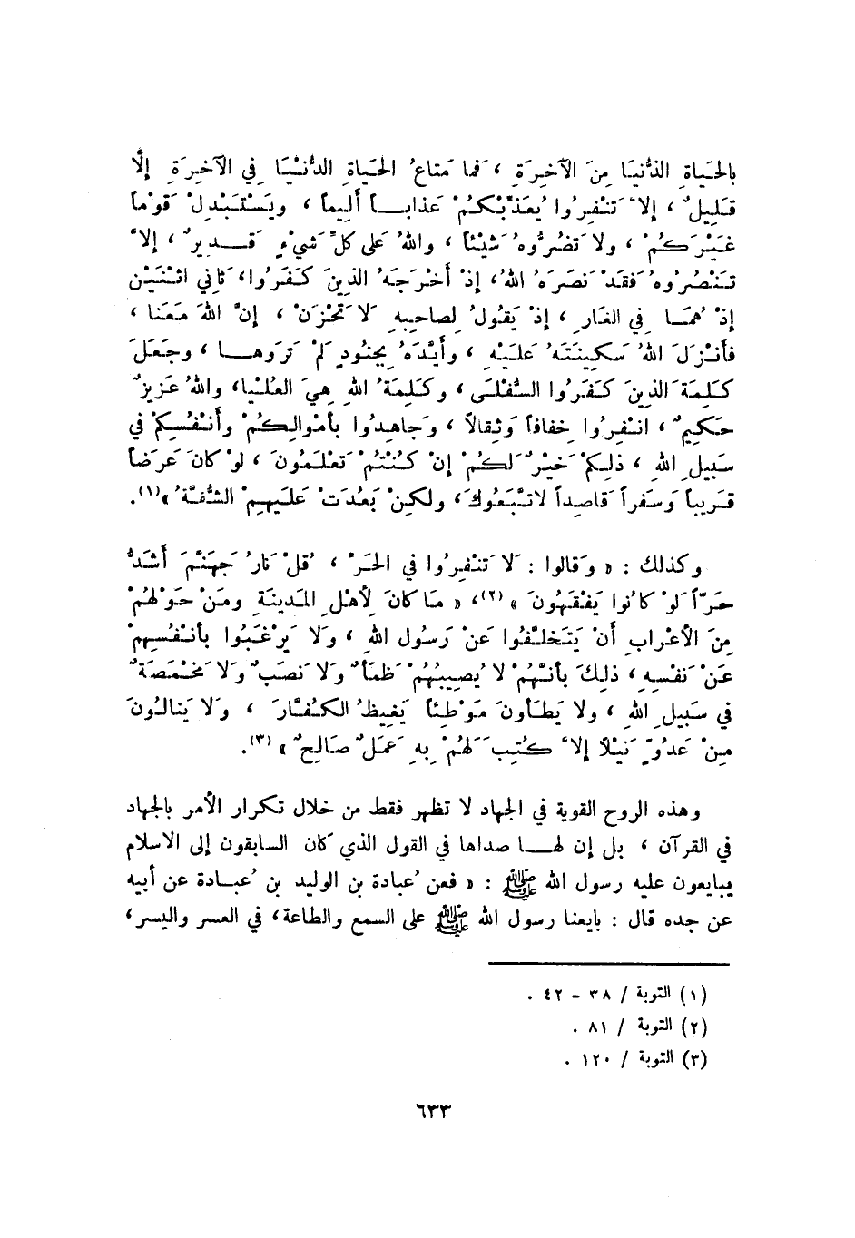 بِالْحَيَاةِ الدُّنْيَا مِنَ الْآخِرَةِ فَمَا مَتَاعُ الْحَيَاةِ الدُّنْيَا فِي الْآخِرَةِ إِلَّا قَلِيلٌ، إِلاّ تَنْفِرُوا يُعَذِّبْكُمْ عَذَابًا أَلِيمًا وَيَسْتَبْدِلْ قَوْمًا غَيْرَكُمْ وَلا تَضُرُّوهُ شَيْئًا وَاللَّهُ عَلَى كُلِّ شَيْءٍ قَدِيرٌ، إِلاّ تَنْصُرُوهُ فَقَدْ نَصَرَهُ اللَّهُ إِذْ أَخْرَجَهُ الَّذِينَ كَفَرُوا ثَانِيَ اثْنَيْنِ إِذْ هُمَا فِي الْغَارِ إِذْ يَقُولُ لِصَاحِبِهِ لا تَحْزَنْ إِنَّ اللَّهَ مَعَنَا فَأَنْزَلَ اللَّهُ سَكِينَتَهُ عَلَيْهِ وَأَيَّدَهُ بِجُنُودٍ لَمْ تَرَوْهَا وَجَعَلَ كَلِمَةَ الَّذِينَ كَفَرُوا السُّفْلَى وَكَلِمَةُ اللَّهِ هِيَ الْعُلْيَا وَاللَّهُ عَزِيزٌ حَكِيمٌ، انْفِرُوا خِفَافًا وَثِقَالًا وَجَاهِدُوا بِأَمْوَالِكُمْ وَأَنْفُسِكُمْ فِي سَبِيلِ اللَّهِ ذَلِكُمْ خَيْرٌ لَكُمْ إِنْ كُنْتُمْ تَعْلَمُونَ، لَوْ كَانَ عَرَضًا قَرِيبًا وَسَفَرًا قَاصِدًا لَاتَّبَعُوكَ وَلَكِنْ بَعُدَتْ عَلَيْهِمُ الشُّقَّةُ} 1.