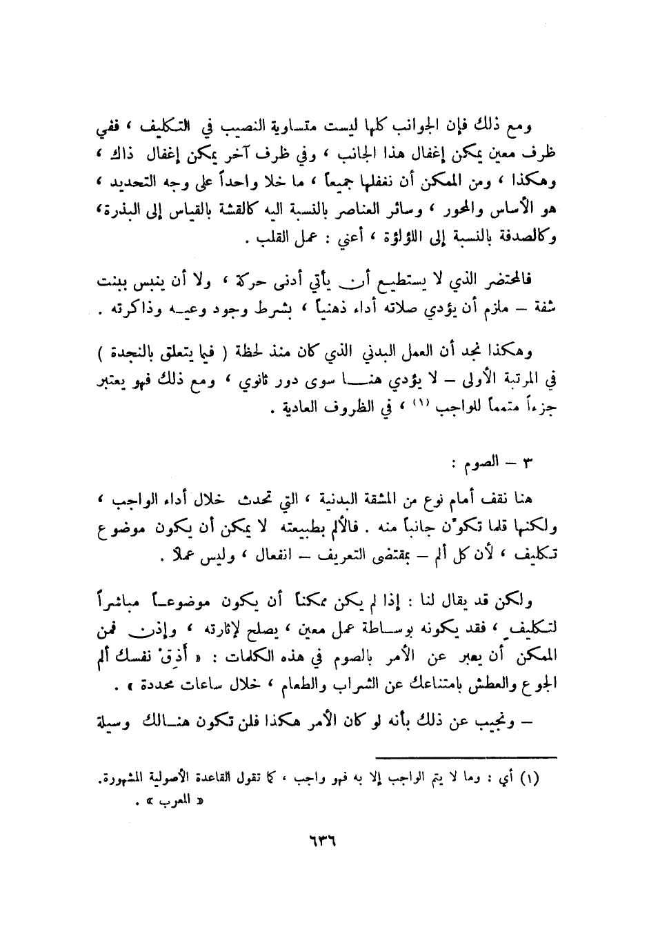 هنا نقف أمام نوع من المشقة البدنية، التي تحدث خلال أداء الواجب، ولكنها قلما تكون جانبًا منه. فالألم بطبيعته لا يمكن أن يكون موضوع تكليف؛ لأن كل ألم -بمقتضى التعريف- انفعال، وليس عملًا.