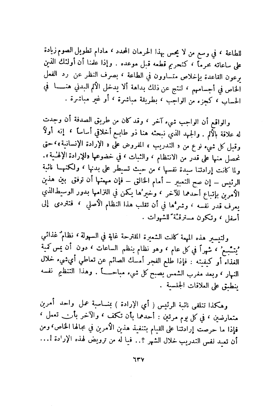 للطاعة، في وسع من لا يحس بهذا الحرمان المحدد، ما دام تطويل الصوم زيادة على ساعاته محرمًا، كتحريم قطعه قبل موعده. وإذا علمنا أن أولئك الذين يرعون القاعدة بإخلاص متساوون في الطاعة، بصرف النظر عن رد الفعل الخاص في أجسامهم، لنتج عن ذلك بداهة ألا يدخل الألم البدني هنا في الحساب، كجزء من الواجب، بطريقة مباشرة، أو غير مباشرة.
