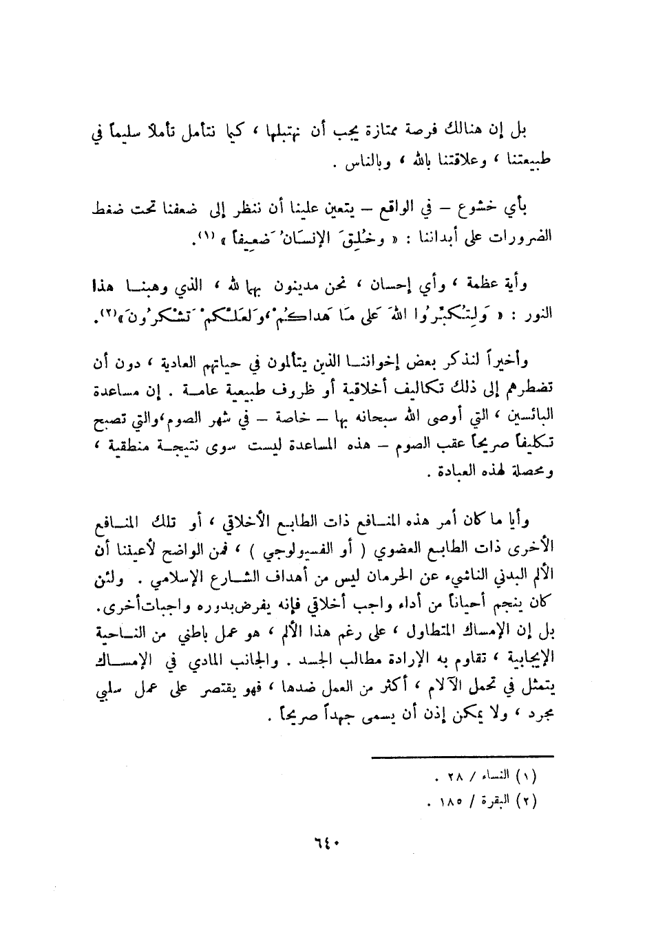وأيًّا ما كان أمر هذه المنافع ذات الطابع الأخلاقي، أو تلك المنافع الأخرى ذات الطابع العضوي "أو الفسيولوجي" فمن الواضح لأعيننا أن الألم البدني الناشئ عن الحرمان ليس من أهداف الشارع الإسلامي. ولئن كان ينجم أحيانًا من أداء واجب أخلاقي فإنه يفرض بدوره واجبات أخرى. بل إن الإمساك المتطاول، على رغم هذا الألم، هو عمل باطني من الناحية الإيجابية، تقاوم به الإرادة مطالب الجسد. والجانب المادي في الإمساك يتمثل في تحمل الآلام أكثر من العمل ضدها، فهو يقتصر على عمل سلبي مجرد، ولا يمكن إذن أن يسمى جهدًا صريحًا.