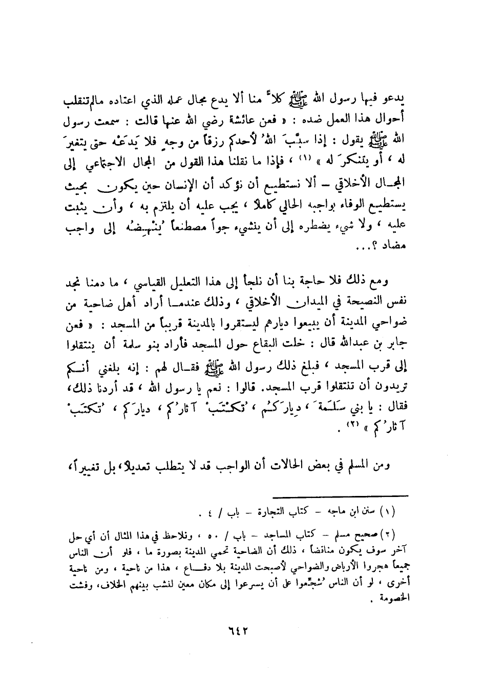 ومع ذلك فلا حاجة بنا أن نلجأ إلى هذا التعليل القياسي، ما دمنا نجد نفس النصيحة في الميدان الأخلاقي، وذلك عندما أراد أهل ضاحية من ضواحي المدينة أن يبيعوا ديارهم ليستقروا بالمدينة قريبًا من المسجد: "فعن جابر بن عبد الله قال: خلت البقاع حول المسجد فأراد بنو سلمة أن ينتقلوا إلى قرب المسجد، فبلغ ذلك رسول الله -صلى الله عليه وسلم- فقال لهم: "إنه بلغني أنكم تريدون أن تنتقلوا قرب المسجد". قالوا: نعم يا رسول الله، قد أردنا ذلك، فقال: " يا بني سلمة، دياركم، تكتب آثاركم، دياركم، تكتب آثاركم" 2.
