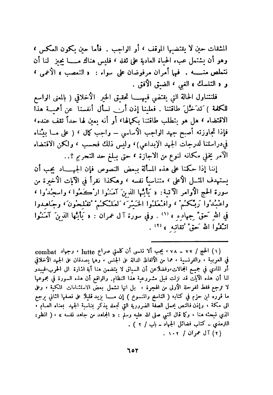 1 الحج: 77-78، يجب ألا ننسى أن كلمتي صراع lutte، وجهاد combat في العربية، والفرنسية، هما من الألفاظ الدالة على الجنس، وهما يصدقان على الجهد الأخلاقي أو المادي في جميع المجالات، وفضلًا عن أن السياق لا يتضمن هنا أية إشارة إلى الحرب فيبدو لنا أن هذه الآيات قد نزلت قبل مشروعية هذا النظام. والواقع أن هذه السورة في مجموعها لا ترجع فقط للمرحلة الأولى من الهجرة، بل إنها تشمل بعض الاستثناءات المكية، وعلى ما قرره ابن حزم في كتابه "الناسخ والمنسوخ": إن ما يزيد قليلًا على نصفها الثاني يرجع إلى مكة، وإذن فالنص يحمل الصفة الضرورية التي تجعله يذكر بمناسبة الجهد بمعناه العام، الذي نبحثه هنا، وكما قال النبي, صلى الله عليه وسلم: "المجاهد من جاهد نفسه"، "انظر: الترمذي, كتاب فضائل الجهاد, باب 2".