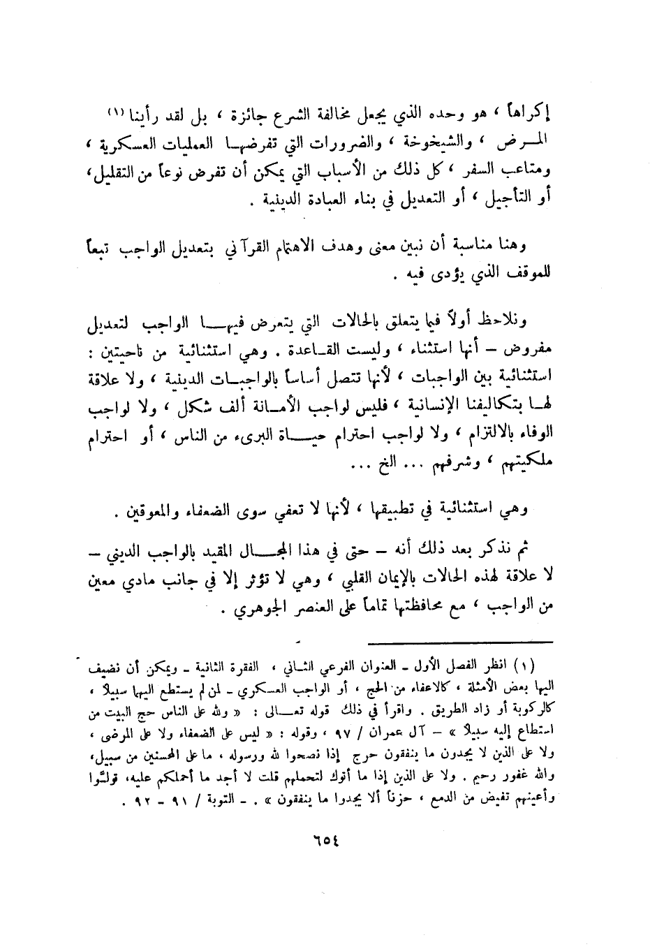 1 انظر الفصل الأول, العنوان الفرعي الثاني، الفقرة الثانية. ويمكن أن نضيف إليها بعض الأمثلة، كالإعفاء من الحج، أو الواجب العسكري -لمن لم يستطع إليهما سبيلًا، كالركوبة أو زاد الطريق. واقرأ في ذلك قوله تعالى: {وَلِلَّهِ عَلَى النَّاسِ حِجُّ الْبَيْتِ مَنِ اسْتَطَاعَ إِلَيْهِ سَبِيلًا} [آل عمران: 97] ، وقوله: {لَيْسَ عَلَى الضُّعَفَاءِ وَلا عَلَى الْمَرْضَى وَلا عَلَى الَّذِينَ لا يَجِدُونَ مَا يُنْفِقُونَ حَرَجٌ إِذَا نَصَحُوا لِلَّهِ وَرَسُولِهِ مَا عَلَى الْمُحْسِنِينَ مِنْ سَبِيلٍ وَاللَّهُ غَفُورٌ رَحِيمٌ، وَلا عَلَى الَّذِينَ إِذَا مَا أَتَوْكَ لِتَحْمِلَهُمْ قُلْتَ لا أَجِدُ مَا أَحْمِلُكُمْ عَلَيْهِ تَوَلَّوْا وَأَعْيُنُهُمْ تَفِيضُ مِنَ الدَّمْعِ حَزَنًا أَلّا يَجِدُوا مَا يُنْفِقُون} [التوبة: 91-92] .