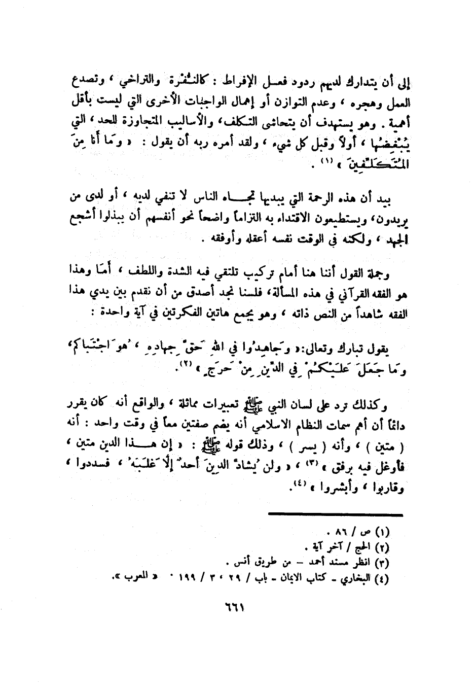 وكذلك ترد على لسان النبي -صلى الله عليه وسلم- تعبيرات مماثلة، والواقع أنه كان يقرر دائمًا أن أهم سمات النظام الإسلامي أن يضم صفتين معًا في وقت واحد: إنه "متين"، وإنه "يسر"، وذلك قوله, صلى الله عليه وسلم: "إن هذا الدين متين، فأوغل فيه برفق" 3، "ولن يشاد الدين أحدًا إلا غلبه، فسددوا، وقاربوا، وأبشروا" 4.