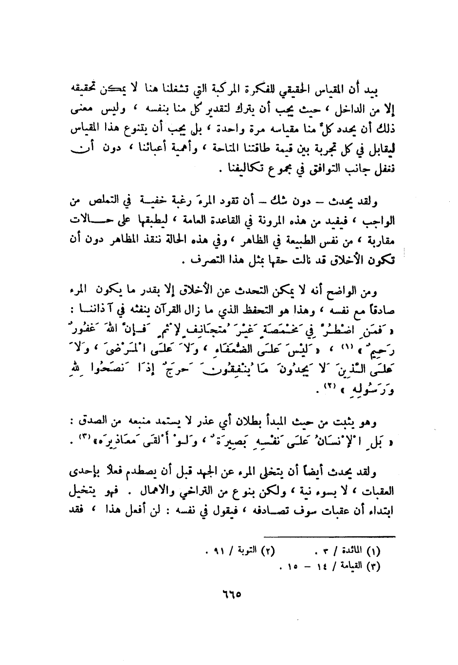 ومن الواضح أنه لا يمكن التحدث عن الأخلاق إلا بقدر ما يكون المرء صادقًا مع نفسه، وهذا هو التحفظ الذي ما زال القرآن ينفثه في آذاننا: {فَمَنِ اضْطُرَّ فِي مَخْمَصَةٍ غَيْرَ مُتَجَانِفٍ لإِثْمٍ فَإِنَّ اللَّهَ غَفُورٌ رَحِيمٌ} 1، {لَيْسَ عَلَى الضُّعَفَاءِ وَلا عَلَى الْمَرْضَى وَلا عَلَى الَّذِينَ لا يَجِدُونَ مَا يُنْفِقُونَ حَرَجٌ إِذَا نَصَحُوا لِلَّهِ وَرَسُولِهِ} 2.