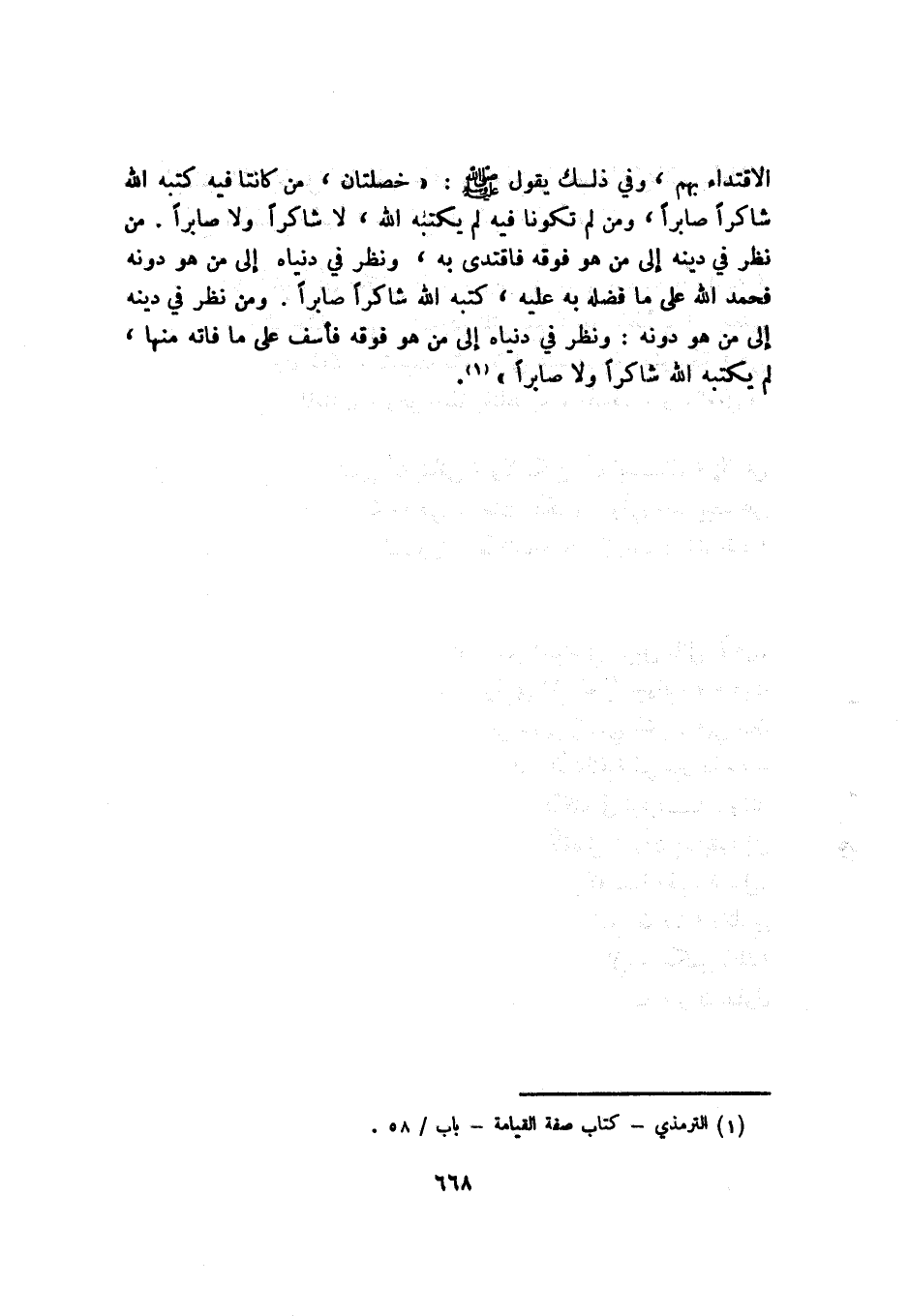 الاقتداء بهم، وفي ذلك يقول, صلى الله عليه وسلم: "خصلتان، من كانتا فيه كتبه الله شاكرًا صابرًا، ومن لم تكونا فيه لم يكتبه الله، لا شاكرًا ولا صابرًا. من نظر في دينه إلى من هو فوقه فاقتدى به، ونظر في دنياه إلى من هو دونه فحمد الله على ما فضله به عليه، كتبه الله شاكرًا صابرًا. ومن نظر في دينه إلى من هو دونه, ونظر في دنياه إلى من هو فوقه فأسف على ما فاته منها، لم يكتبه الله شاكرًا ولا صابرًا"1.