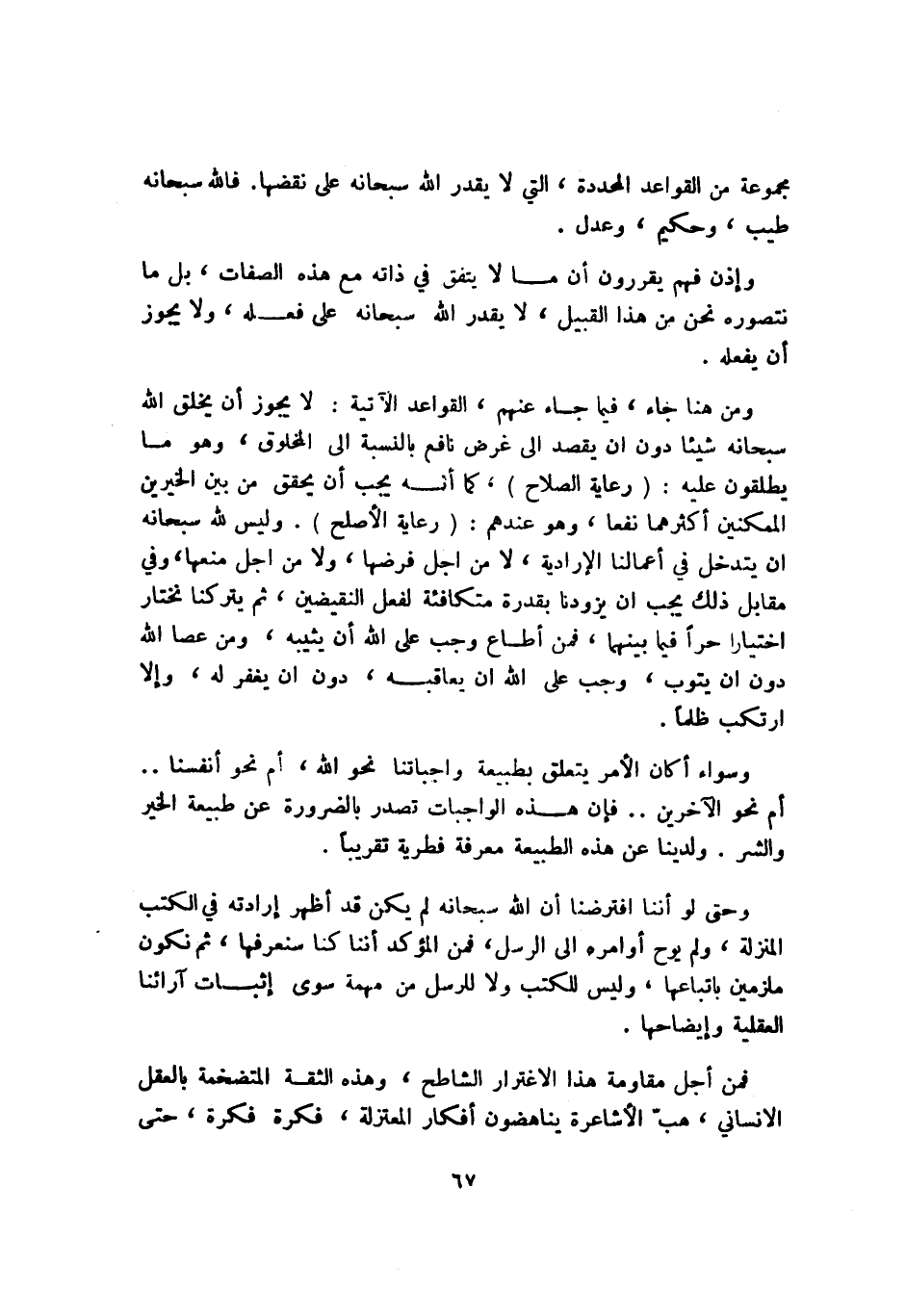 ومن هنا جاء، فيما جاء عنهم، القواعد الآتية: لا يجوز أن يخلق الله سبحانه شيئًا دون أن يقصد إلى غرض نافع بالنسبة إلى المخلوق، وهو ما يطلقون عليه: "رعاية الصلاح"، كما أنه يجب أن يحقق من بين الخيرين الممكنين أكثرهما نفعًا، وهو عندهم: "رعاية الأصلح". وليس لله سبحانه أن يتدخل في أعمالنا الإرادية، لا من أجل فرضها، ولا من أجل منعها، وفي مقابل ذلك يجب أن يزودنا بقدرة متكافئة لفعل النقيضين، ثم يتركنا نختار اختيارًا حرًّا فيما بينهما، فمن أطاع وجب على الله أن يثيبه، ومن عصا الله دون أن يتوب، وجب على الله أن يعاقبه، دون أن يغفر له، وإلا ارتكب ظلمًا.