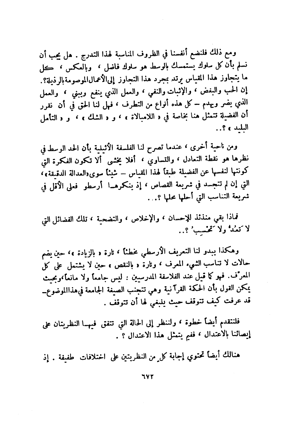ومع ذلك, فلنضع أنفسنا في الظروف المناسبة لهذا التدرج. هل يجب أن نسلم بأن كل سلوك يستمسك بالوسط هو سلوك فاضل، وبالعكس، كل ما يتجاوز هذا المقياس يرتد بمجرد هذا التجاوز إلى الأعمال الموصومة بالرذيلة؟