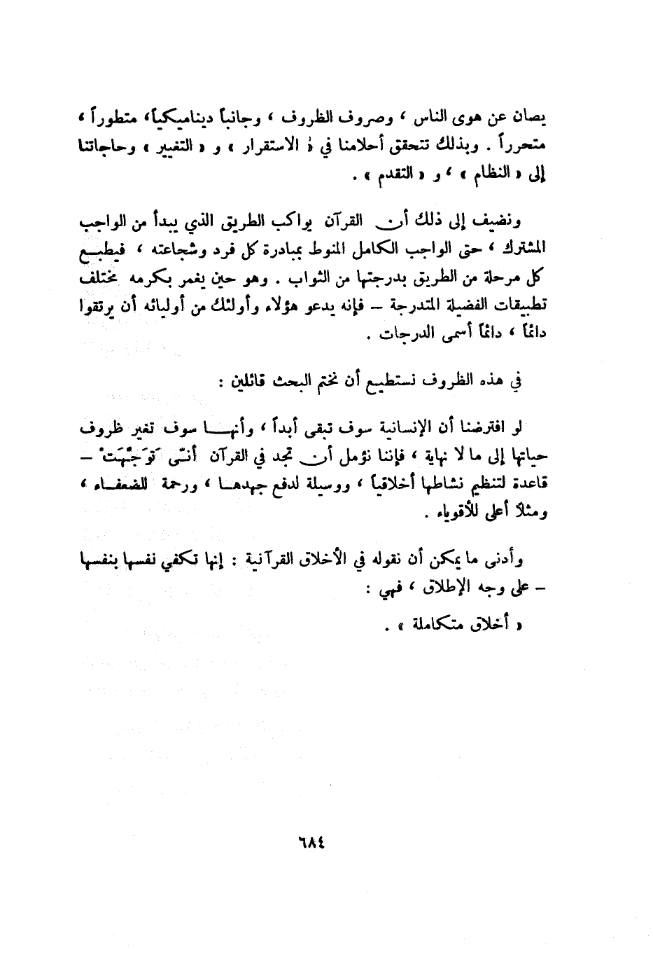 وأدنى ما يمكن أن نقوله في الأخلاق القرآنية: إنها تكفي نفسها بنفسها على وجه الإطلاق، فهي:
