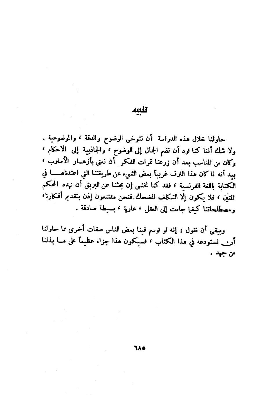 حاولنا خلال هذه الدراسة أن نتوخى الوضوح والدقة، والموضوعية. ولا شك أننا كنا نود أن نضم الجمال إلى الوضوح، والجاذبية إلى الأحكام وكان من المناسب بعد أن زرعنا ثمرات الفكر أن نعنى بأزهار الأسلوب، بيد أنه لما كان هذا الترف غريبًا بعض الشيء عن طريقتنا التي اعتدناها في الكتابة باللغة الفرنسية، فقد كنا نخشى إن بحثنا عن البريق أن نهدد المحكم المتين، فلا يكون إلا التكلف المضحك. فنحن مقتنعون إذن بتقديم أفكارنا، ومصطلحاتنا كيفما جاءت إلى العقل، عارية، بسيطة صادقة.
