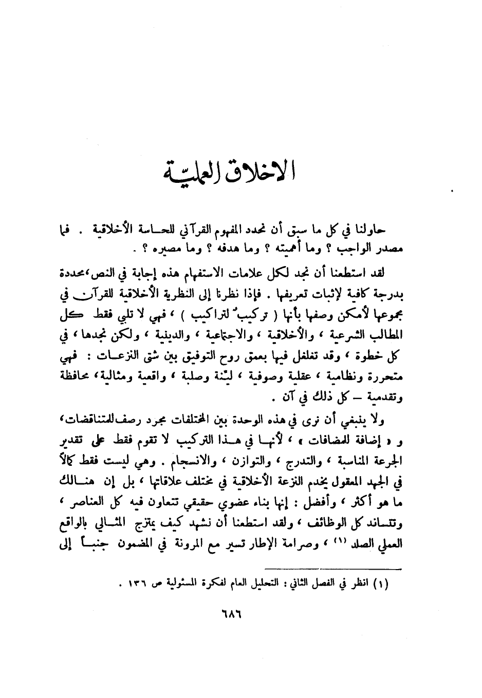 لقد استطعنا أن نجد لكل علامات الاستفهام هذه إجابة في النص محددة بدرجة كافية لإثبات تعريفها. فإذا نظرنا إلى النظرية الأخلاقية للقرآن في مجموعها لأمكن وصفها بأنها "تركيب لتراكيب"، فهي لا تلبي فقط كل المطالب الشرعية، والأخلاقية، والاجتماعية، والدينية، ولكن نجدها، في كل خطوة، وقد تغلغل فيها بعمق روح التوفيق بين شتى النزعات, فهي متحررة ونظامية، عقلية وصوفية، لينة وصلبة، واقعية ومثالية، محافظة وتقدمية -كل ذلك في آن.