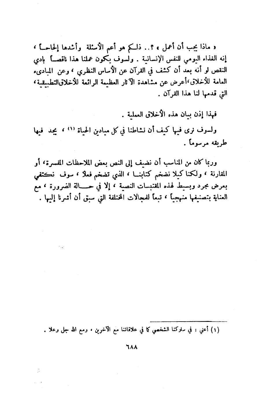 "ماذا يجب أن أعمل"؟ ذلكم هو أعم الأسئلة وأشدها إلحاحًا، إنه الغذاء اليومي للنفس الإنسانية. ولسوف يكون عملنا هذا ناقصًا بادي النقص لو أنه بعد أن كشف في القرآن عن الأساس النظري، وعن المبادئ العامة للأخلاق، أعرض عن مشاهدة الآثار العظيمة الرائعة للأخلاق التطبيقية، التي قدمها لنا هذا القرآن.