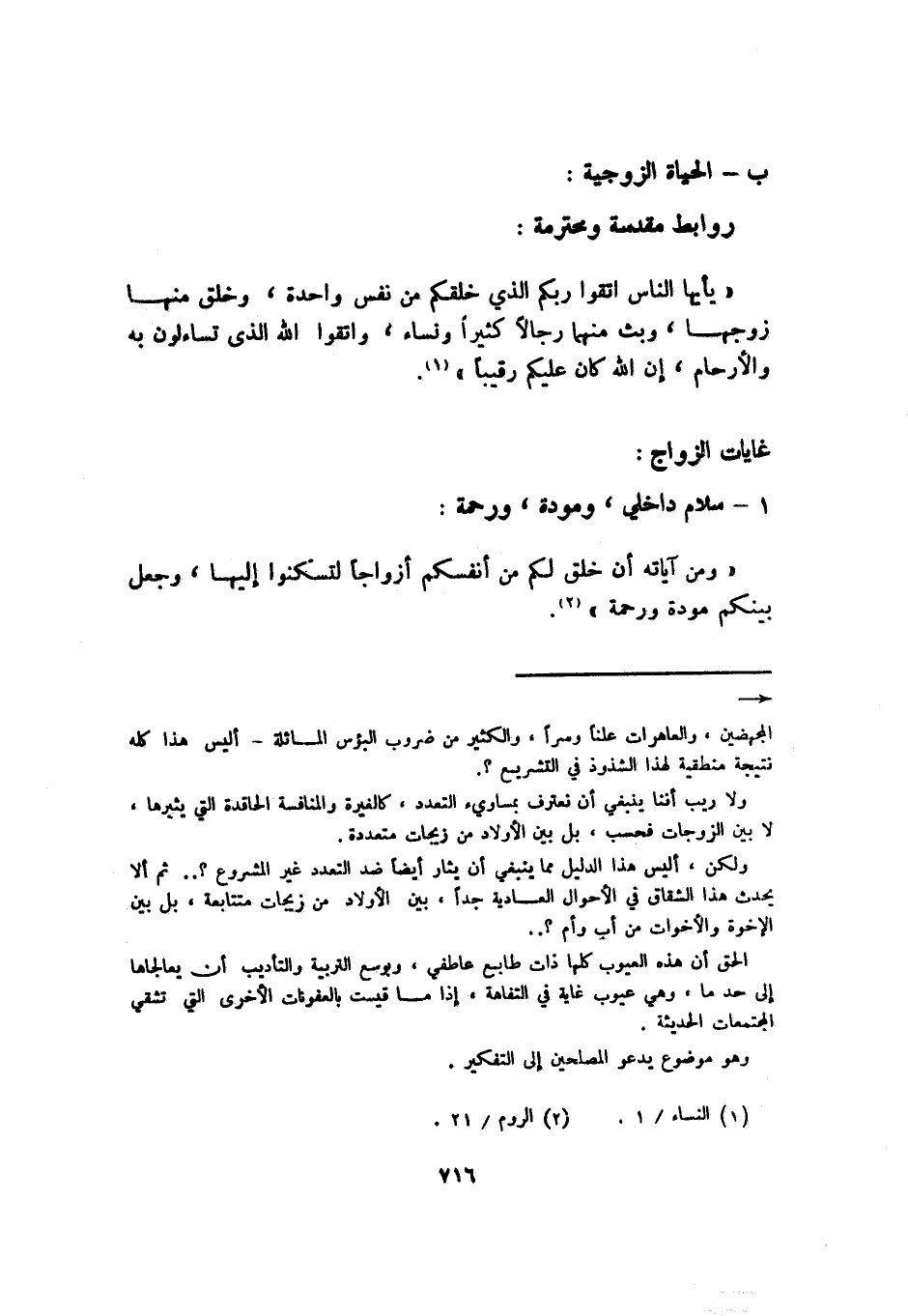 ولا ريب أننا ينبغي أن نعترف بمساوئ التعدد، كالغيرة والمنافسة الحاقدة التي يثيرها، لا بين الزوجات فحسب، بل بين الأولاد من زيجات متعددة.