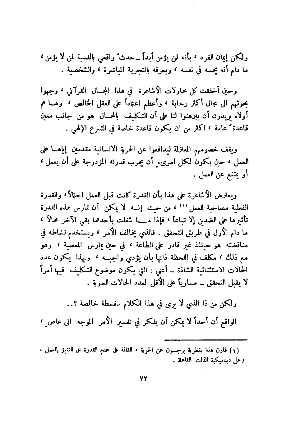 ويقف خصومهم المعتزلة ليدافعوا عن الحرية الإنسانية مقدمين إياها على العمل، حين يكون لكل امرئ أن يجرب قدرته المزدوجة على أن يعمل، أو يمتنع عن العمل.