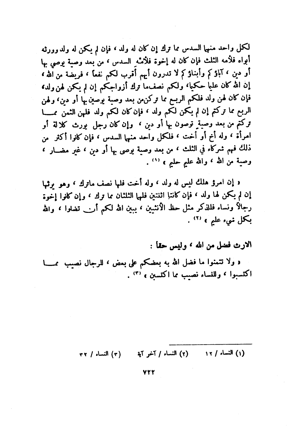 لِكُلِّ وَاحِدٍ مِنْهُمَا السُّدُسُ مِمَّا تَرَكَ إِنْ كَانَ لَهُ وَلَدٌ فَإِنْ لَمْ يَكُنْ لَهُ وَلَدٌ وَوَرِثَهُ أَبَوَاهُ فَلِأُمِّهِ الثُّلُثُ فَإِنْ كَانَ لَهُ إِخْوَةٌ فَلِأُمِّهِ السُّدُسُ مِنْ بَعْدِ وَصِيَّةٍ يُوصِي بِهَا أَوْ دَيْنٍ آبَاؤُكُمْ وَأَبْنَاؤُكُمْ لا تَدْرُونَ أَيُّهُمْ أَقْرَبُ لَكُمْ نَفْعًا فَرِيضَةً مِنَ اللَّهِ إِنَّ اللَّهَ كَانَ عَلِيمًا حَكِيمًا، وَلَكُمْ نِصْفُ مَا تَرَكَ أَزْوَاجُكُمْ إِنْ لَمْ يَكُنْ لَهُنَّ وَلَدٌ فَإِنْ كَانَ لَهُنَّ وَلَدٌ فَلَكُمُ الرُّبُعُ مِمَّا تَرَكْنَ مِنْ بَعْدِ وَصِيَّةٍ يُوصِينَ بِهَا أَوْ دَيْنٍ وَلَهُنَّ الرُّبُعُ مِمَّا تَرَكْتُمْ إِنْ لَمْ يَكُنْ لَكُمْ وَلَدٌ فَإِنْ كَانَ لَكُمْ وَلَدٌ فَلَهُنَّ الثُّمُنُ مِمَّا تَرَكْتُمْ مِنْ بَعْدِ وَصِيَّةٍ تُوصُونَ بِهَا أَوْ دَيْنٍ وَإِنْ كَانَ رَجُلٌ يُورَثُ كَلالَةً أَوِ امْرَأَةٌ وَلَهُ أَخٌ أَوْ أُخْتٌ فَلِكُلِّ وَاحِدٍ مِنْهُمَا السُّدُسُ فَإِنْ كَانُوا أَكْثَرَ مِنْ ذَلِكَ فَهُمْ شُرَكَاءُ فِي الثُّلُثِ مِنْ بَعْدِ وَصِيَّةٍ يُوصَى بِهَا أَوْ دَيْنٍ غَيْرَ مُضَارٍّ وَصِيَّةً مِنَ اللَّهِ وَاللَّهُ عَلِيمٌ حَلِيمٌ} 1.