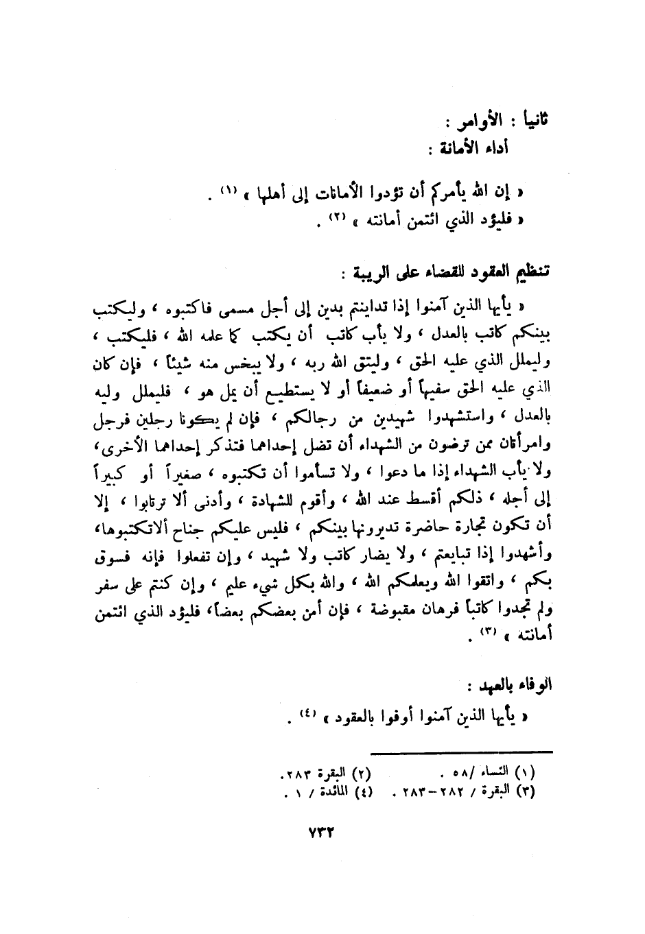 {يَا أَيُّهَا الَّذِينَ آمَنُوا إِذَا تَدَايَنْتُمْ بِدَيْنٍ إِلَى أَجَلٍ مُسَمًّى فَاكْتُبُوهُ وَلْيَكْتُبْ بَيْنَكُمْ كَاتِبٌ بِالْعَدْلِ وَلا يَأْبَ كَاتِبٌ أَنْ يَكْتُبَ كَمَا عَلَّمَهُ اللَّهُ فَلْيَكْتُبْ وَلْيُمْلِلِ الَّذِي عَلَيْهِ الْحَقُّ وَلْيَتَّقِ اللَّهَ رَبَّهُ وَلا يَبْخَسْ مِنْهُ شَيْئًا فَإِنْ كَانَ الَّذِي عَلَيْهِ الْحَقُّ سَفِيهًا أَوْ ضَعِيفًا أَوْ لا يَسْتَطِيعُ أَنْ يُمِلَّ هُوَ فَلْيُمْلِلْ وَلِيُّهُ بِالْعَدْلِ وَاسْتَشْهِدُوا شَهِيدَيْنِ مِنْ رِجَالِكُمْ فَإِنْ لَمْ يَكُونَا رَجُلَيْنِ فَرَجُلٌ وَامْرَأَتَانِ مِمَّنْ تَرْضَوْنَ مِنَ الشُّهَدَاءِ أَنْ تَضِلَّ إِحْدَاهُمَا فَتُذَكِّرَ إِحْدَاهُمَا الْأُخْرَى وَلا يَأْبَ الشُّهَدَاءُ إِذَا مَا دُعُوا وَلا تَسْأَمُوا أَنْ تَكْتُبُوهُ صَغِيرًا أَوْ كَبِيرًا إِلَى أَجَلِهِ ذَلِكُمْ أَقْسَطُ عِنْدَ اللَّهِ وَأَقْوَمُ لِلشَّهَادَةِ وَأَدْنَى أَلَّا تَرْتَابُوا إِلَّا أَنْ تَكُونَ تِجَارَةً حَاضِرَةَ تُدِيرُونَهَا بَيْنَكُمْ فَلَيْسَ عَلَيْكُمْ جُنَاحٌ أَلَّا تَكْتُبُوهَا وَأَشْهِدُوا إِذَا تَبَايَعْتُمْ وَلا يُضَارَّ كَاتِبٌ وَلا شَهِيدٌ وَإِنْ تَفْعَلُوا فَإِنَّهُ فُسُوقٌ بِكُمْ وَاتَّقُوا اللَّهَ وَيُعَلِّمُكُمُ اللَّهُ وَاللَّهُ بِكُلِّ شَيْءٍ عَلِيمٌ، وَإِنْ كُنْتُمْ عَلَى سَفَرٍ وَلَمْ تَجِدُوا كَاتِبًا فَرِهَانٌ مَقْبُوضَةٌ فَإِنْ أَمِنَ بَعْضُكُمْ بَعْضًا فَلْيُؤَدِّ الَّذِي اؤْتُمِنَ أَمَانَتَهُ} 3.