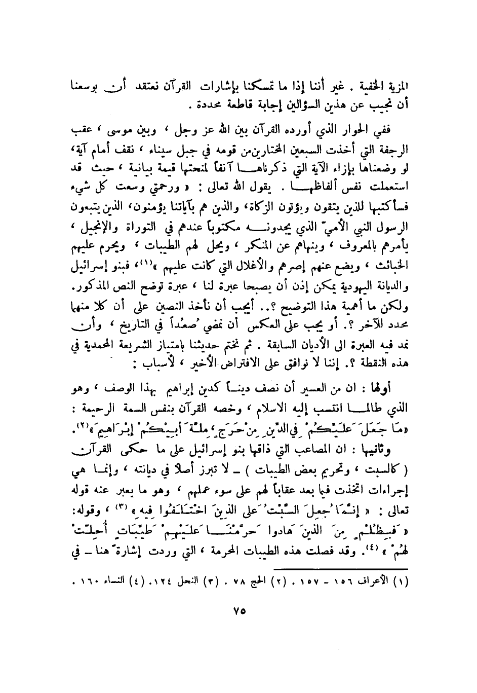 ففي الحوار الذي أورده القرآن بين الله عز وجل، وبين موسى، عقب الرجفة التي أخذت السبعين المختارين من قومه في جبل سيناء، نقف أمام آية، لو وضعناها بإزاء الآية التي ذكرناها آنفًا لمنحتها قيمة بيانية، حيث قد استعملت نفس ألفاظها. يقول الله تعالى: {وَرَحْمَتِي وَسِعَتْ كُلَّ شَيْءٍ فَسَأَكْتُبُهَا لِلَّذِينَ يَتَّقُونَ وَيُؤْتُونَ الزَّكَاةَ وَالَّذِينَ هُمْ بِآياتِنَا يُؤْمِنُونَ، الَّذِينَ يَتَّبِعُونَ الرَّسُولَ النَّبِيَّ الْأُمِّيَّ الَّذِي يَجِدُونَهُ مَكْتُوبًا عِنْدَهُمْ فِي التَّوْرَاةِ وَالإِنْجِيلِ يَأْمُرُهُمْ بِالْمَعْرُوفِ وَيَنْهَاهُمْ عَنِ الْمُنْكَرِ وَيُحِلُّ لَهُمُ الطَّيِّبَاتِ وَيُحَرِّمُ عَلَيْهِمُ الْخَبَائِثَ وَيَضَعُ عَنْهُمْ إِصْرَهُمْ وَالْأَغْلالَ الَّتِي كَانَتْ عَلَيْهِمْ} 1، فبنو إسرائيل والديانة اليهودية يمكن إذن أن يصبحا عبرة لنا، عبرة توضح النص المذكور. ولكن ما أهمية هذا التوضيح؟ أيجب أن نأخذ النصين على أن كلًّا منهما محدد للآخر؟ أم يجب على العكس أن نمضي صعدًا في التاريخ، وأن نمد فيه العبرة إلى الأديان السابقة، ثم نختم حديثنا بامتياز الشريعة المحمدية في هذه النقطة؟ إننا لا نوافق على الافتراض الأخير؛ لأسباب: