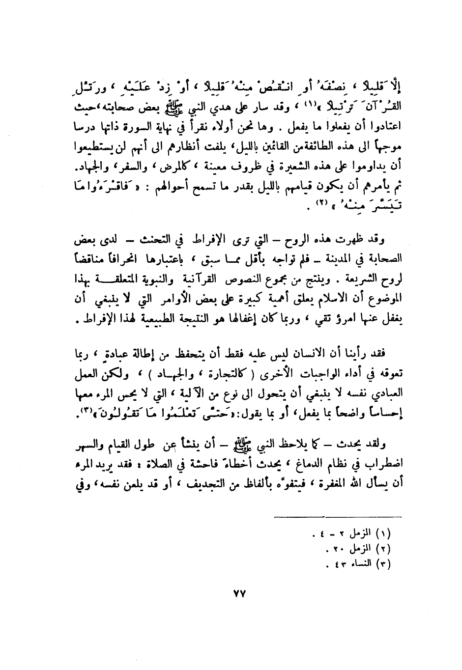 إِلَّا قَلِيلًا، نِصْفَهُ أَوِ انْقُصْ مِنْهُ قَلِيلًا، أَوْ زِدْ عَلَيْهِ وَرَتِّلِ الْقُرْآنَ تَرْتِيلًا} 1، وقد سار على هدي النبي -صلى الله عليه وسلم- بعض صحابته، حيث اعتادوا أن يفعلوا ما يفعل. وها نحن أولاء نقرأ في نهاية السورة ذاتها درسًا موجهًا إلى هذه الطائفة من القائمين بالليل، يلفت أنظارهم إلى أنهم لن يستطيعوا أن يداوموا على هذه الشعيرة في ظروف معينة؛ كالمرض، والسفر، والجهاد. ثم يأمرهم أن يكون قيامهم بالليل بقدر ما تسمح أحوالهم: {فَاقْرَأُوا مَا تَيَسَّرَ مِنْهُ} 2.