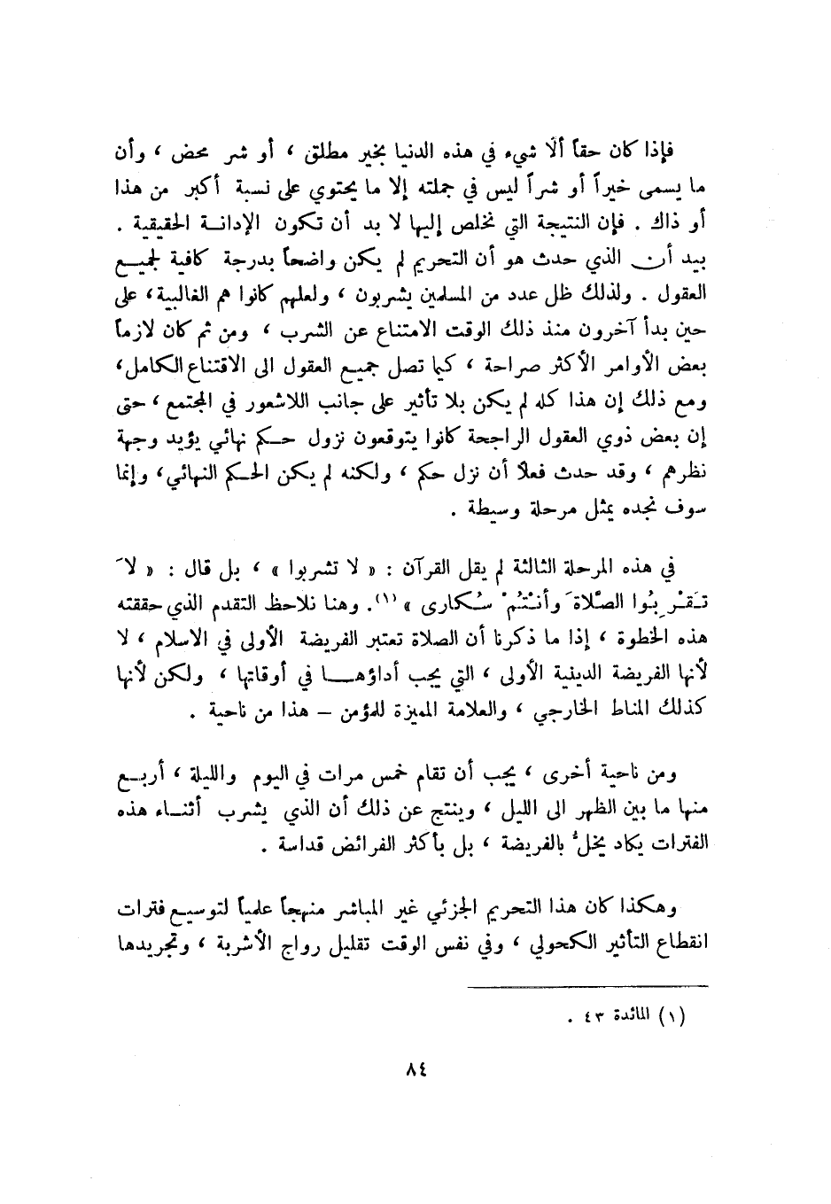 في هذه المرحلة الثالثة لم يقل القرآن: "لا تشربوا"، بل قال: {لا تَقْرَبُوا الصَّلاةَ وَأَنْتُمْ سُكَارَى} 1. وهنا نلاحظ التقدم الذي حققته هذه الخطوة، إذا ما ذكرنا أن الصلاة تعتبر الفريضة الأولى في الإسلام، لا لأنها الفريضة الدينية الأولى، التي يجب أداؤها في أوقاتها، ولكن لأنها كذلك المناط الخارجي والعلامة المميزة للمؤمن -هذا من ناحية.