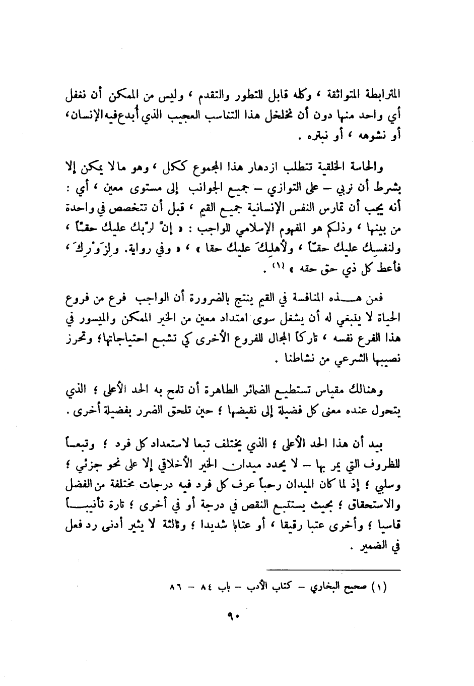 والحاسة الخلقية تتطلب ازدهار هذا المجموع ككل، وهو ما لا يمكن إلا بشرط أن نربي -على التوازي- جميع الجوانب إلى مستوى معين، أي: إنه يجب أن تمارس النفس الإنسانية جميع القيم، قبل أن تتخصص في واحدة من بينها، وذلكم هو المفهوم الإسلامي للواجب: "إن لربك عليك حقًّا، ولنفسك عليك حقًّا، ولأهلك عليك حقًّا" وفي رواية: "ولزَوْرِك, فأعط كل ذي حقٍّ حقه" 1.