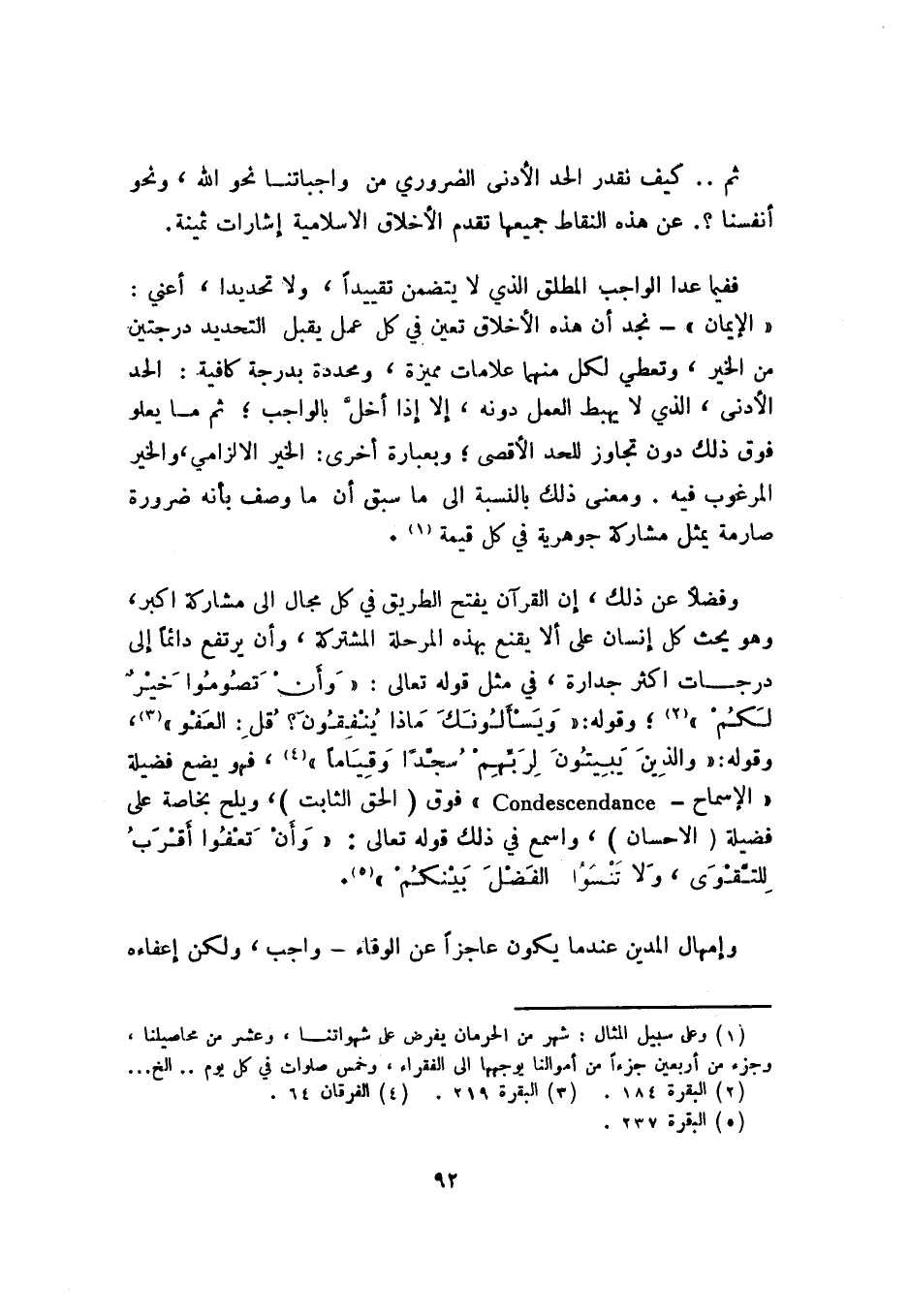 وفضلًا عن ذلك، إن القرآن يفتح الطريق في كل مجال إلى مشاركة أكبر، وهو يحث كل إنسان على ألا يقنع بهذه المرحلة المشتركة، وأن يرتفع دائمًا إلى درجات أكثر جدارة, في مثل قوله تعالى: {وَأَنْ تَصُومُوا خَيْرٌ لَكُمْ} 2؛ وقوله: {وَيَسْأَلونَكَ مَاذَا يُنْفِقُونَ قُلِ الْعَفْوَ} 3، وقوله: {وَالَّذِينَ يَبِيتُونَ لِرَبِّهِمْ سُجَّدًا وَقِيَامًا} 4، فهو يضع فضيلة "الإسماح - CONDESCENDANCE" فوق "الحق الثابت"، ويلح بخاصة على فضيلة "الإحسان"، واسمع في ذلك قوله تعالى: {وَأَنْ تَعْفُوا أَقْرَبُ لِلتَّقْوَى وَلا تَنْسَوُا الْفَضْلَ بَيْنَكُمْ} 5.