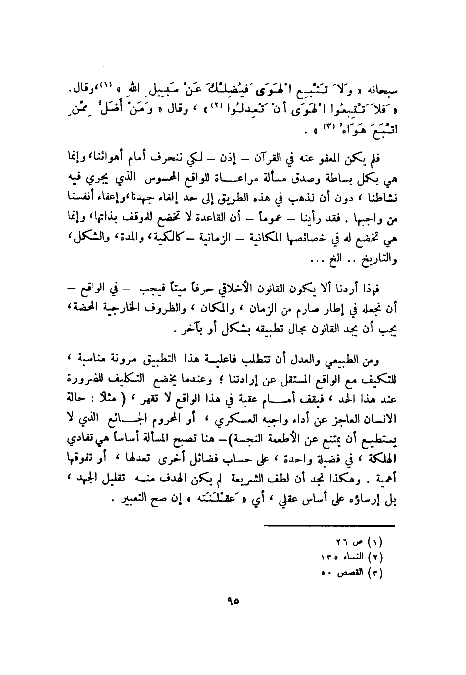 فلم يكن المعفو عنه في القرآن -إذن- لكي ننحرف أمام أهوائنا، وإنما هي بكل بساطة وصدق مسألة مراعاة للواقع المحسوس الذي يجري فيه نشاطنا، دون أن نذهب في هذه الطريق إلى أحد إلغاء جهدنا، وإعفاء أنفسنا من واجبها. فقد رأينا -عمومًا- أن القاعدة لا تخضع للموقف بذاتها، وإنما هي تخضع له في خصائصها المكانية - الزمانية - كالكمية، والمدة، والشكل، والتاريخ ... إلخ.
