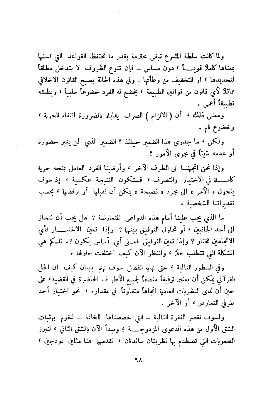 وفي السطور التالية، حتى نهاية الفصل سوف نهتم ببيان كيف أن الحل القرآني يمكن أن يعتبر توفيقًا منصفًا لجميع الأطراف الحاضرة في القضية، على حين أن لدى النظريات العادية اتجاهًا متفاوتًا في مقداره، نحو اختيار أحد طرفي التعارض، أو الآخر.